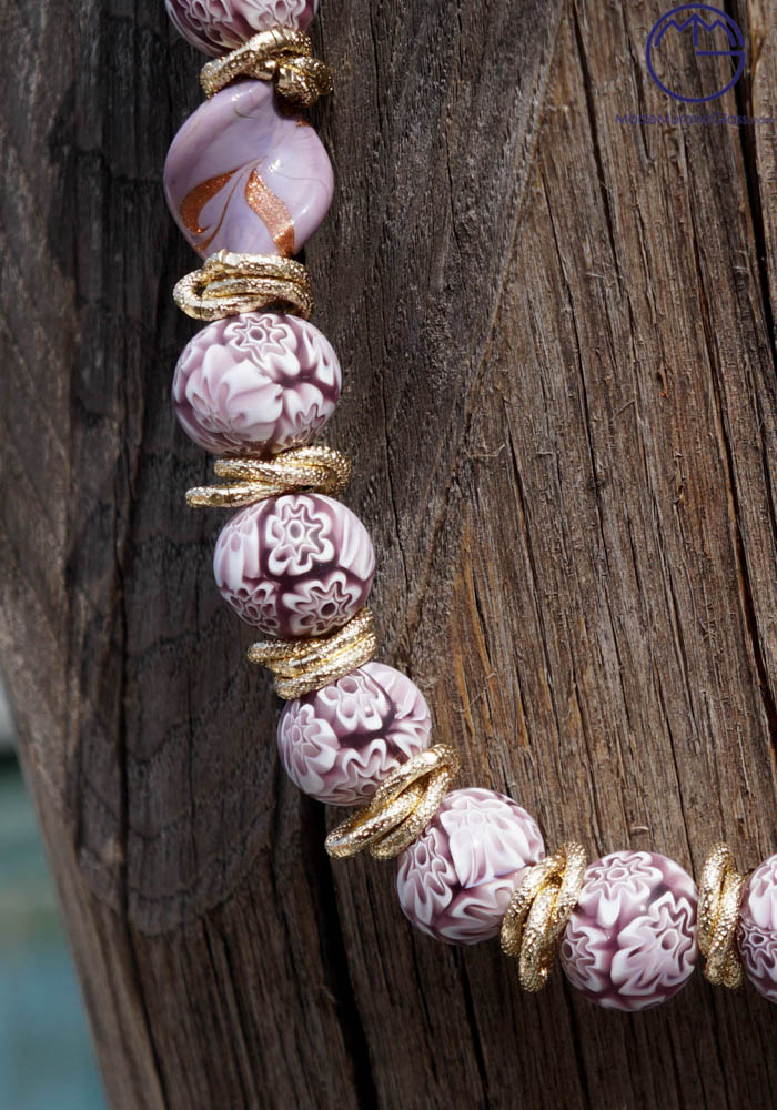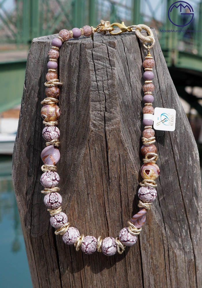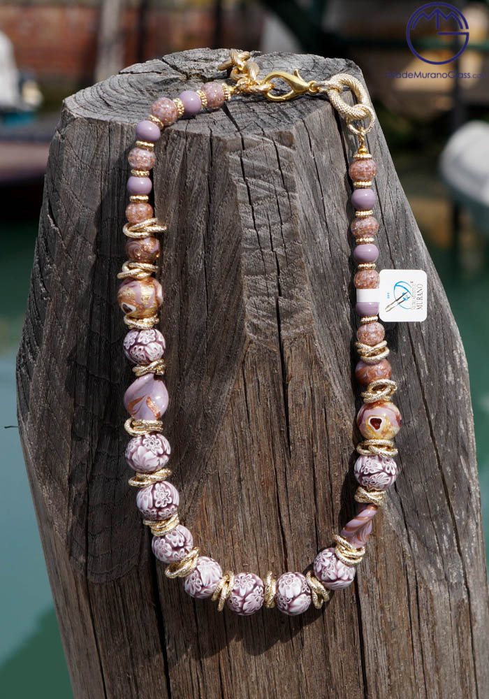 Wonderful necklace in Murano glass, completely handmade with coloured beads and murrine. Venetian glass jewellery are carried out with “lume” technique. Elegant, class and sophistication are suitable words for this amazing Murano collection jewellery.