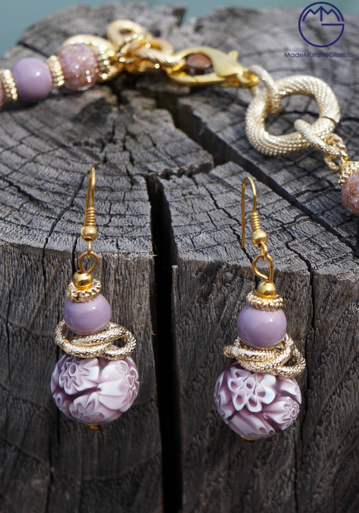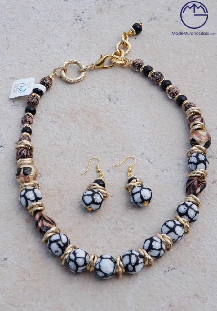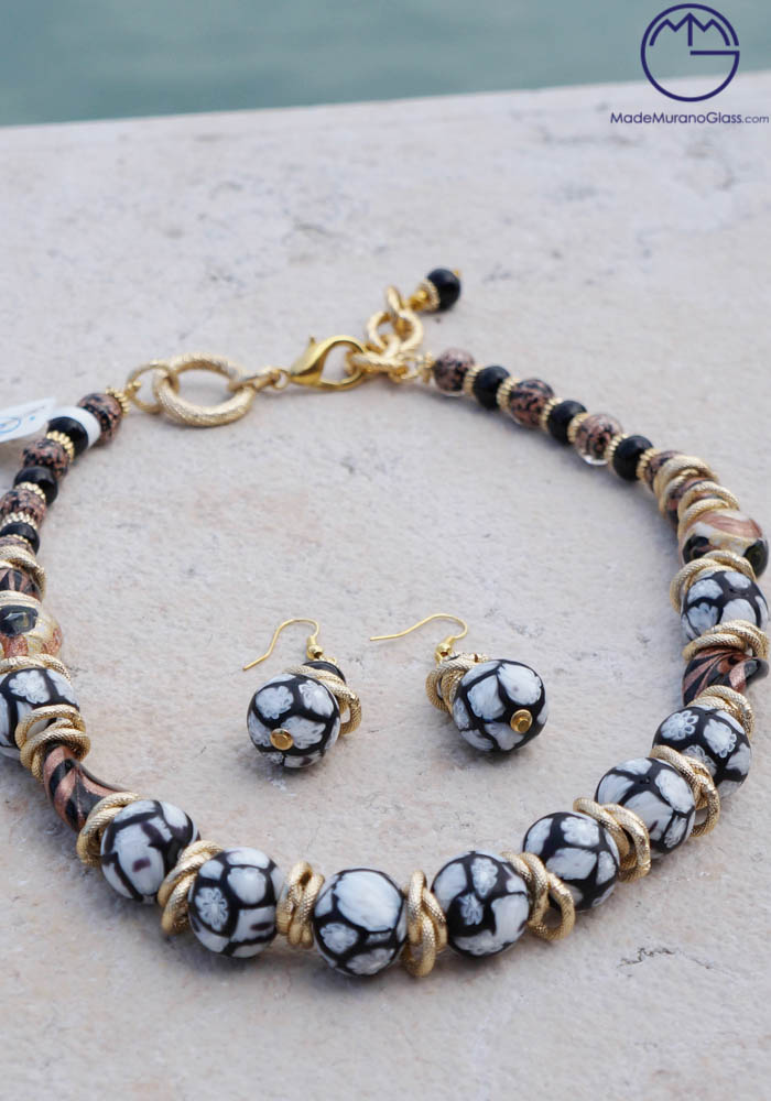Wonderful necklace and earrings in Murano glass, completely handmade with coloured beads and “avventurina“. Venetian glass jewellery are carried out with “lume” technique. Elegant, class and sophistication are suitable words for this amazing Murano collection jewellery.