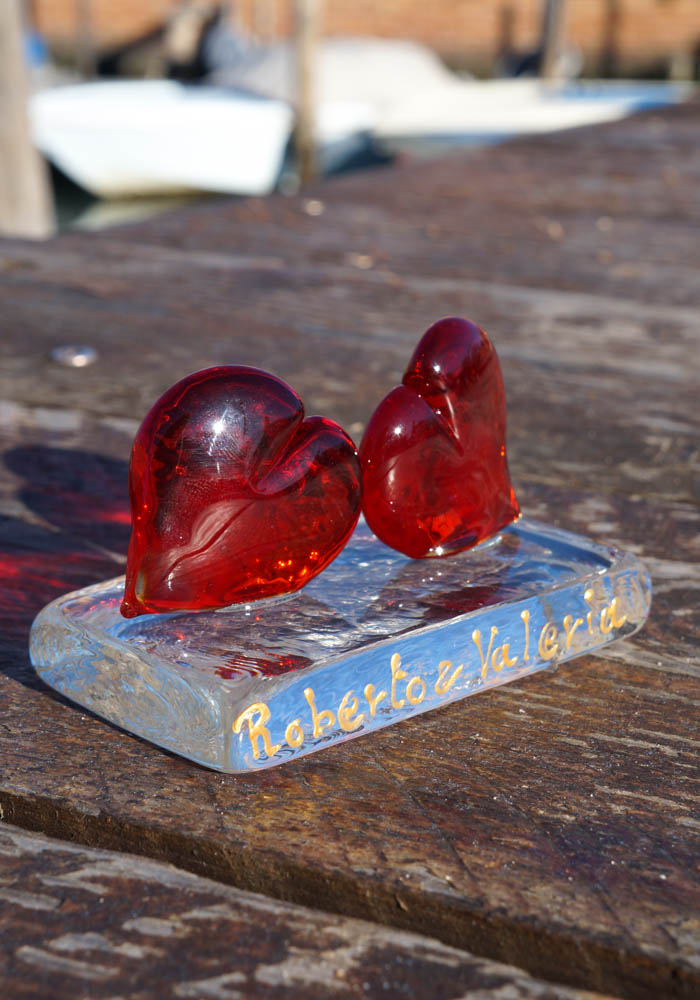Sculpture two hearts in Murano glass with crystal base, possibility to insert your names, hand decorated using golden ink.