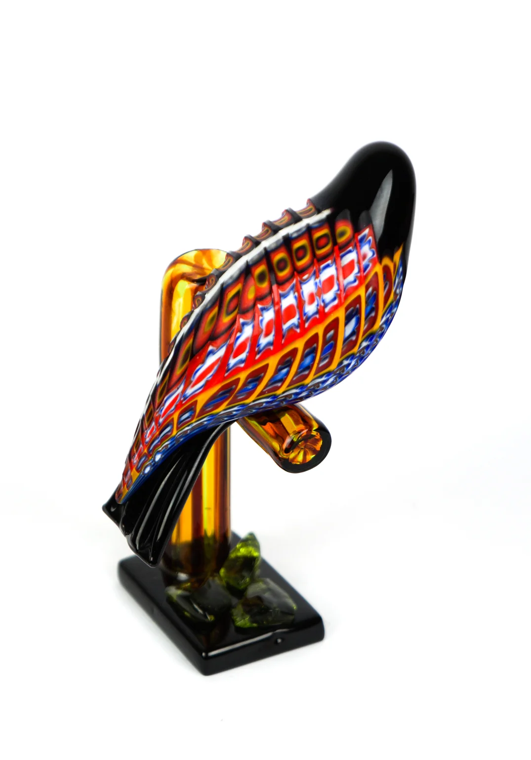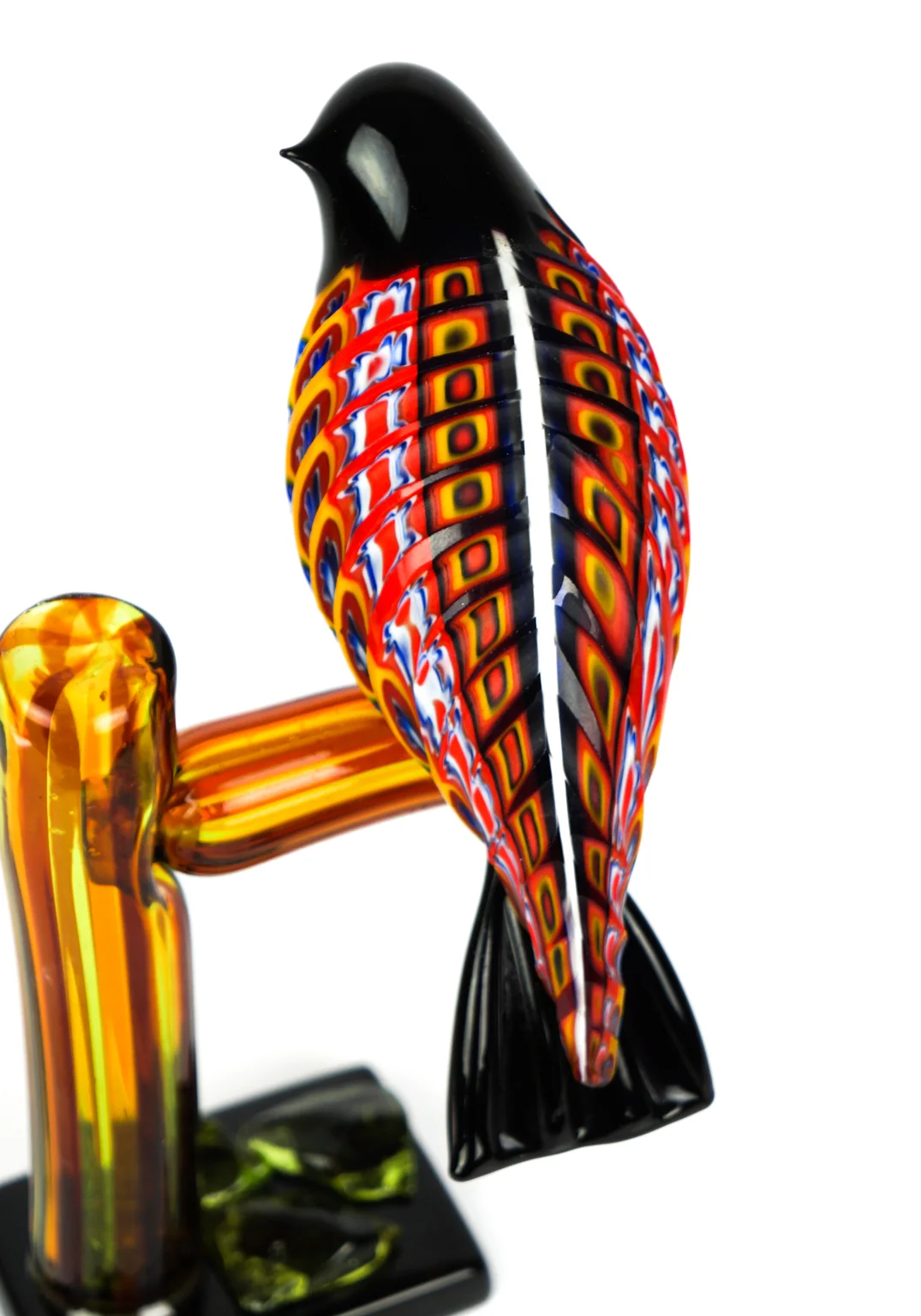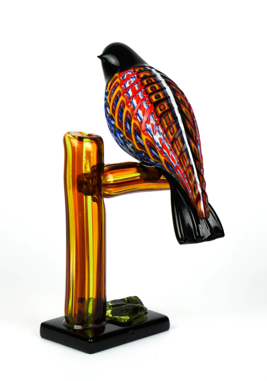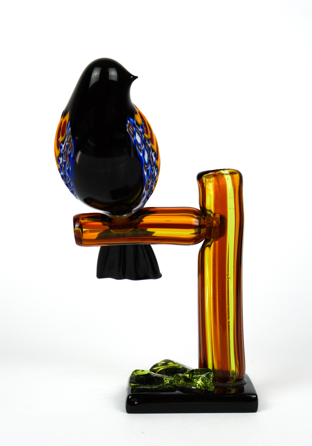 Sculpture of bird in Murano blown glass entirely handmade with millefiori Murrina process and engraving in the body. This process of engraving is called by the Venetian glass masters “Battuto ” or “Molato “.
