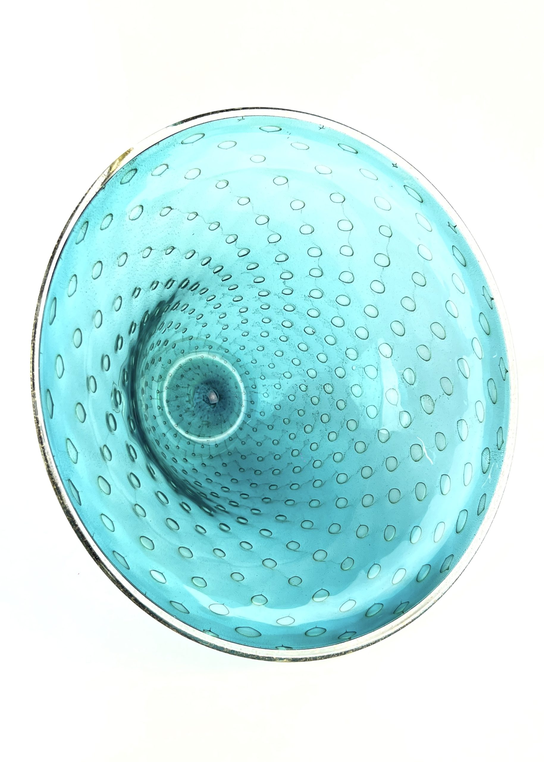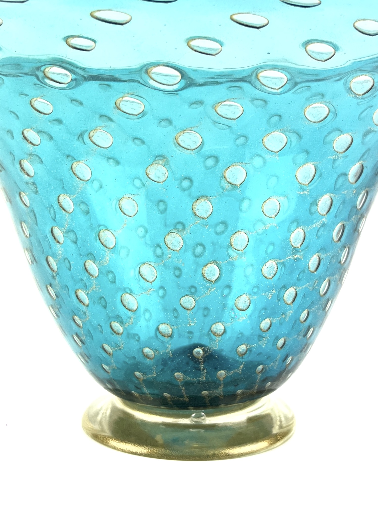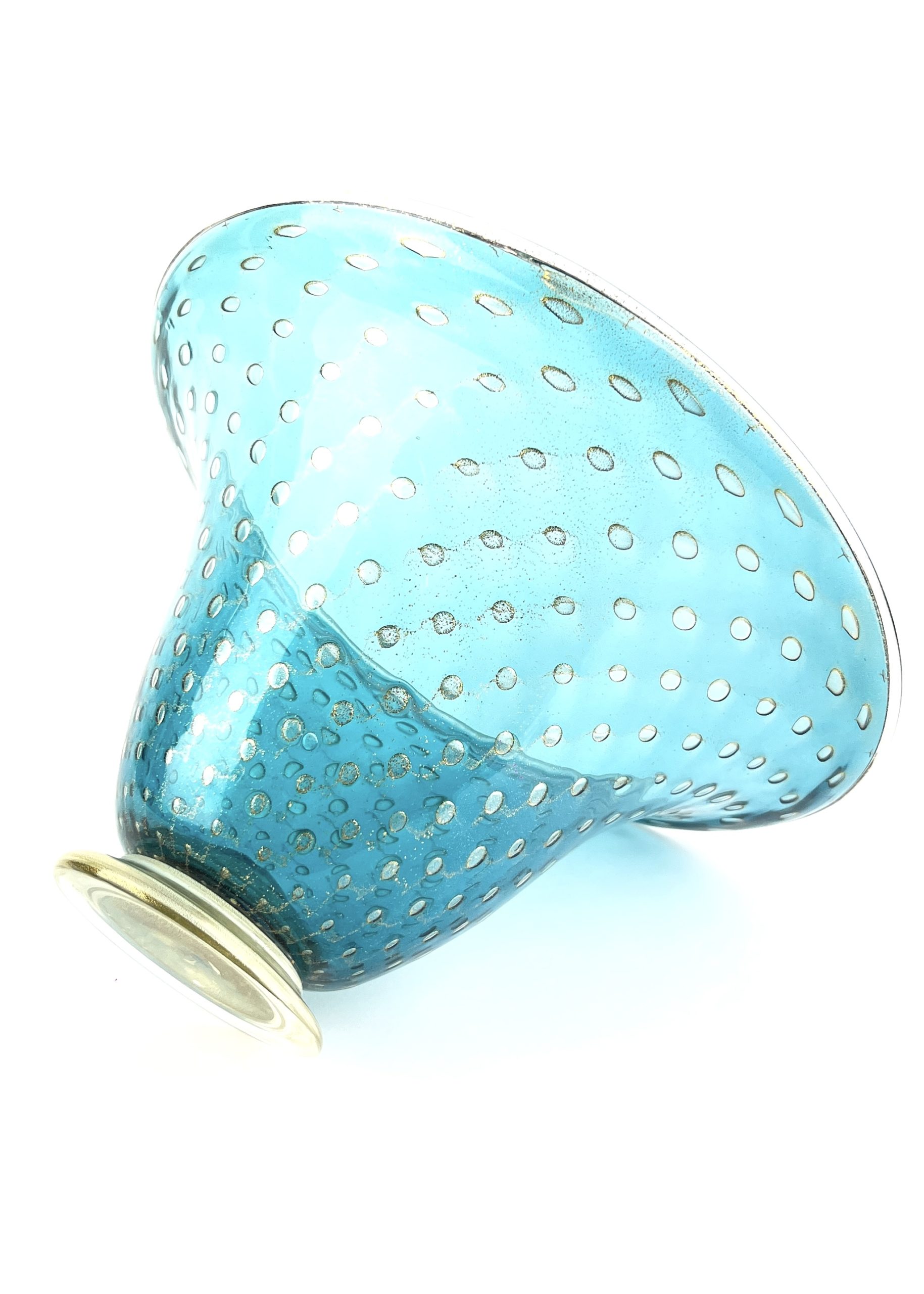 Blown Murano glass centerpiece with 24 carat gold leaf decorations made with the “Balloton” glass working technique.