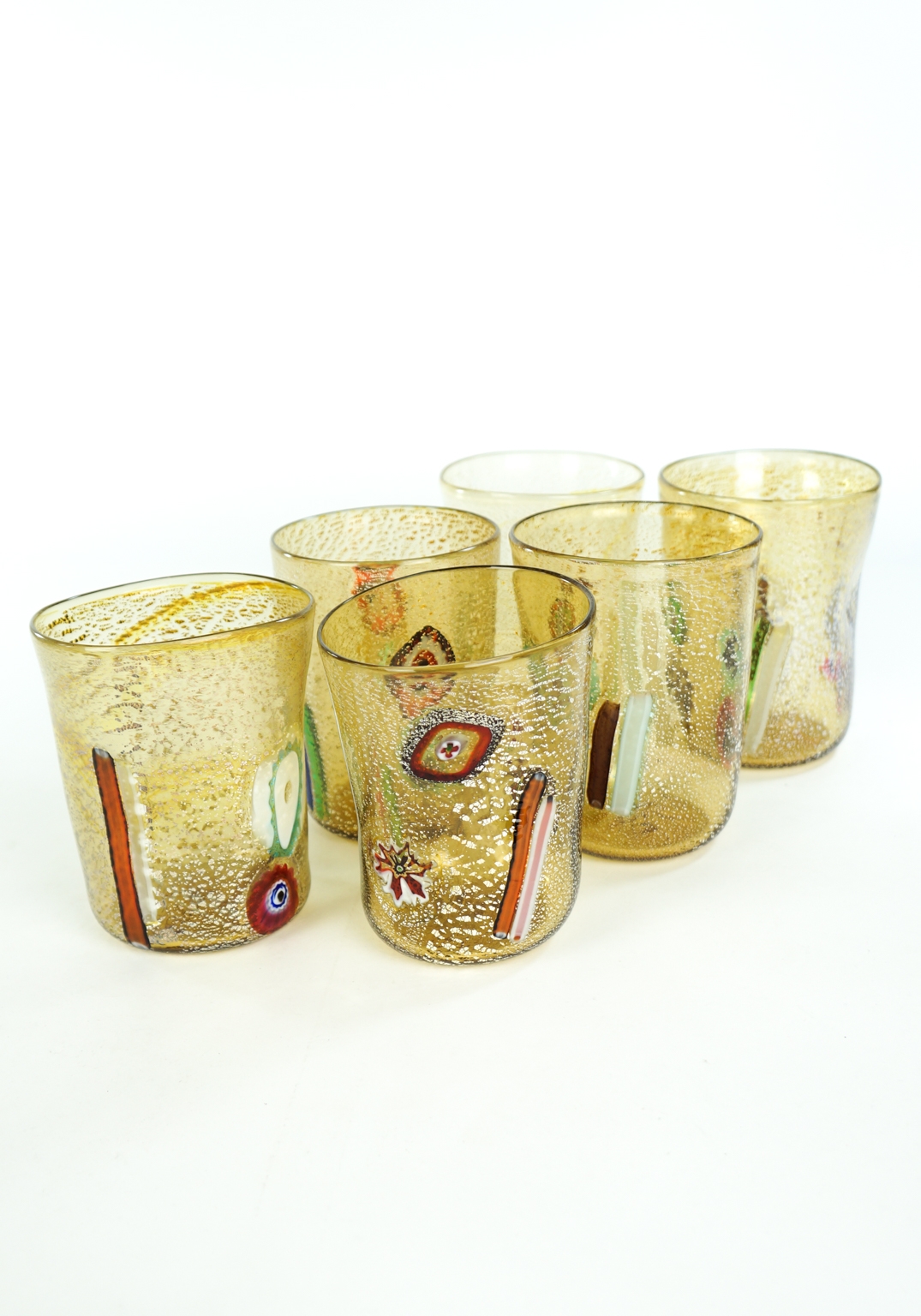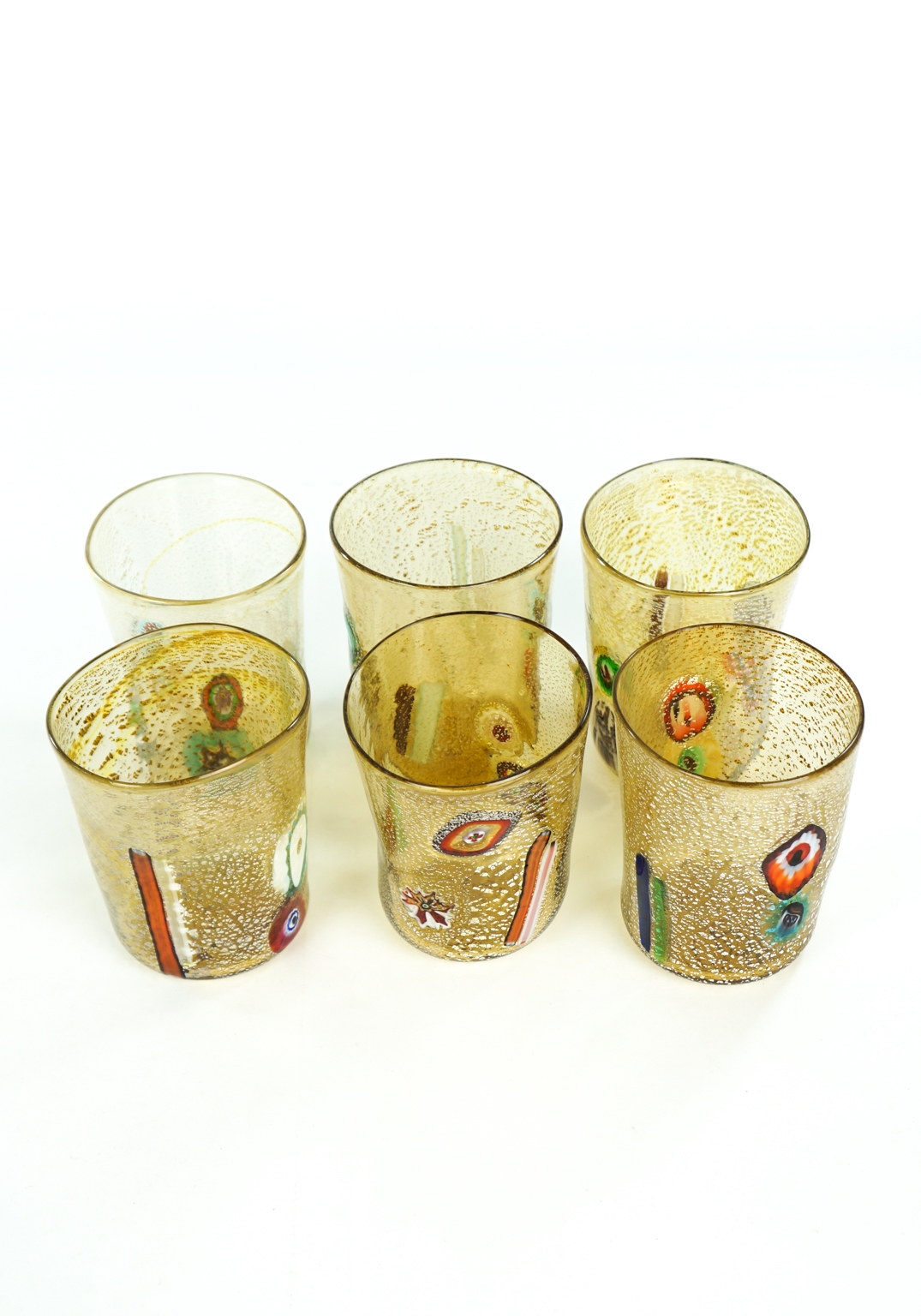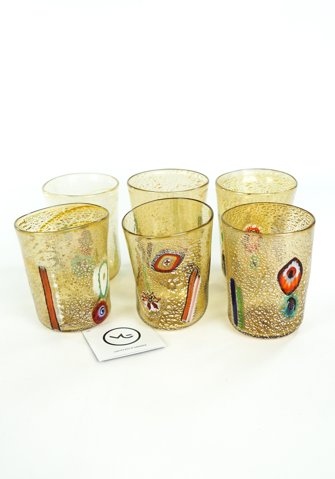 Smoke – Set Of 6 Fumè Murano Drinking Glasses handmade. This set is called “GOTI DE FORNASA”. Tradition has it that the Murano glass master with his collaborators made these Murano glasses to drink during work breaks. The set includes Six Murano Glass Tumblers with decoration in murrina Millefiori and real silver leaf. Each piece is unique in the world for color and shape being made exclusively by hand without the use of molds and shapes. The Set of Glasses can be washed in the dishwasher. DIMENSIONS: Height 12 cm (inches 4,72) Length 8,5 cm (inches 3,34) Weight 1,1 kg