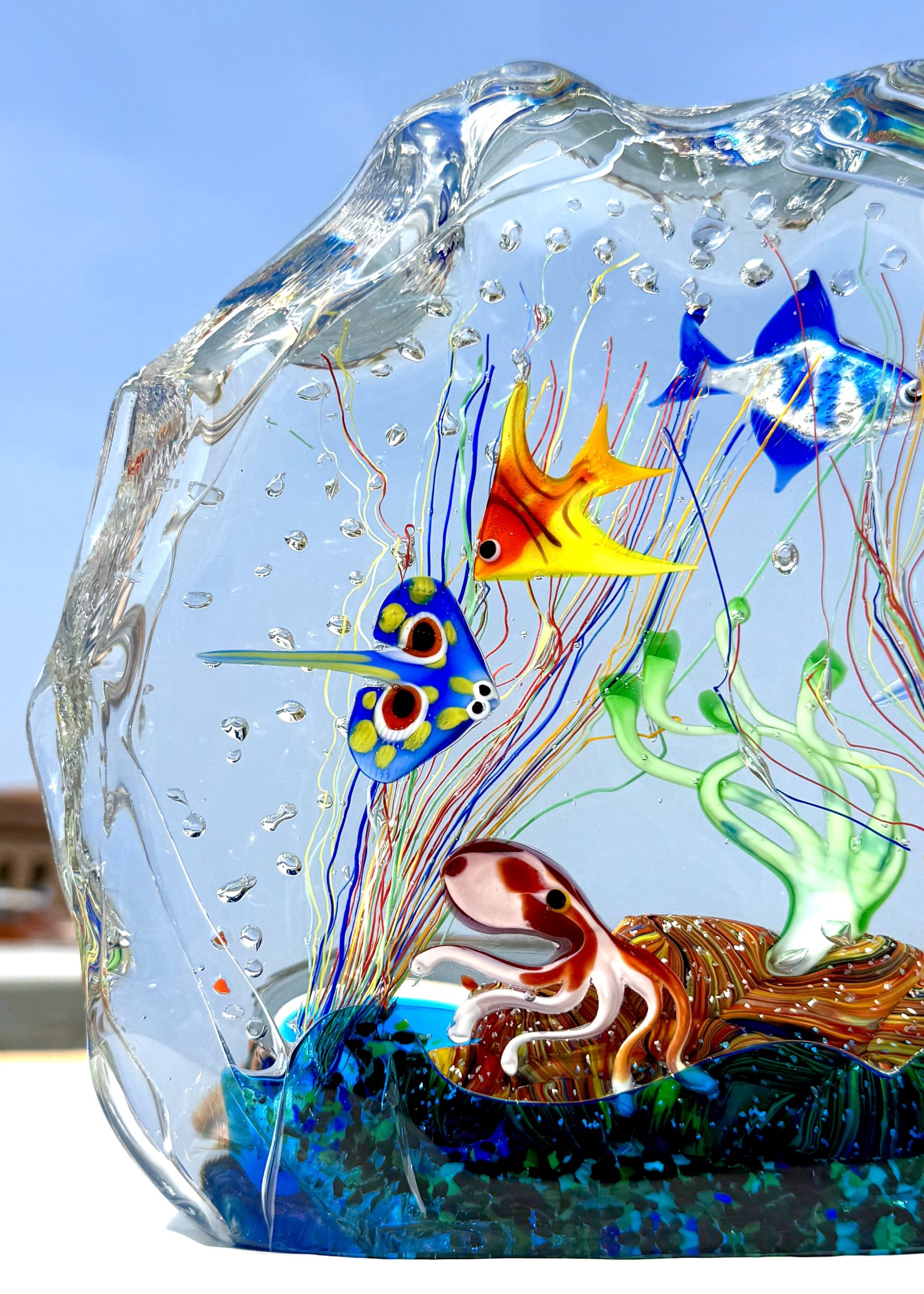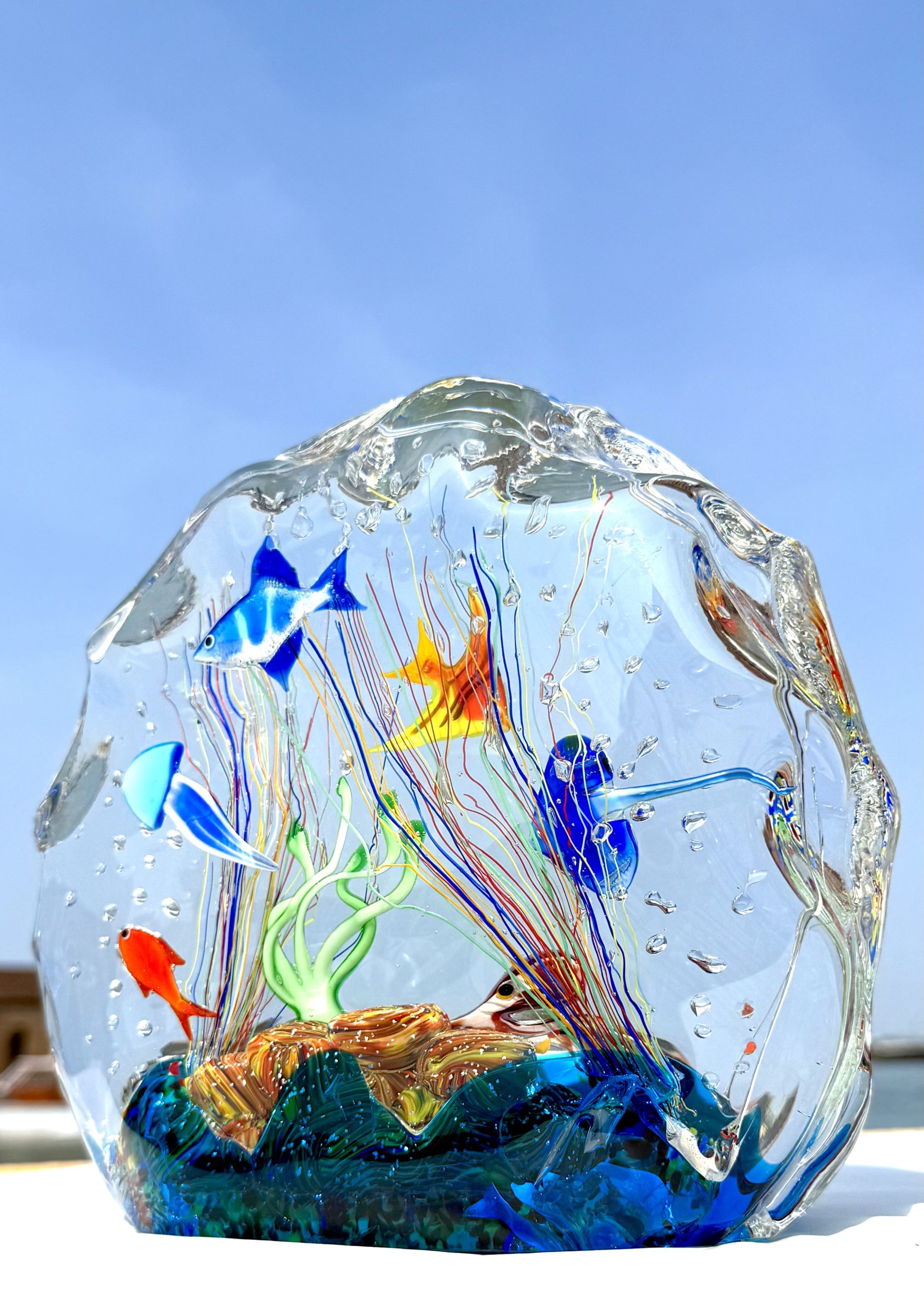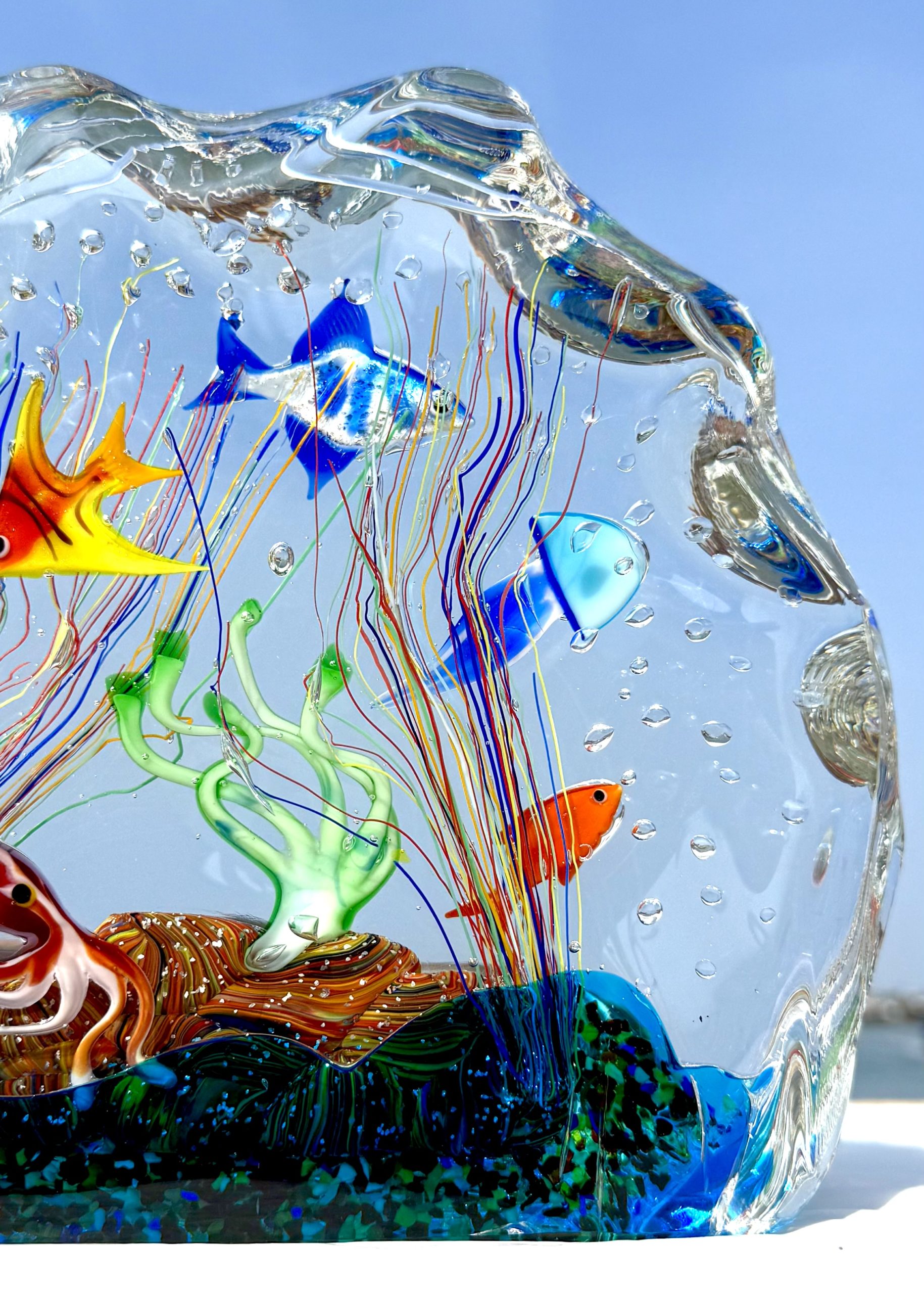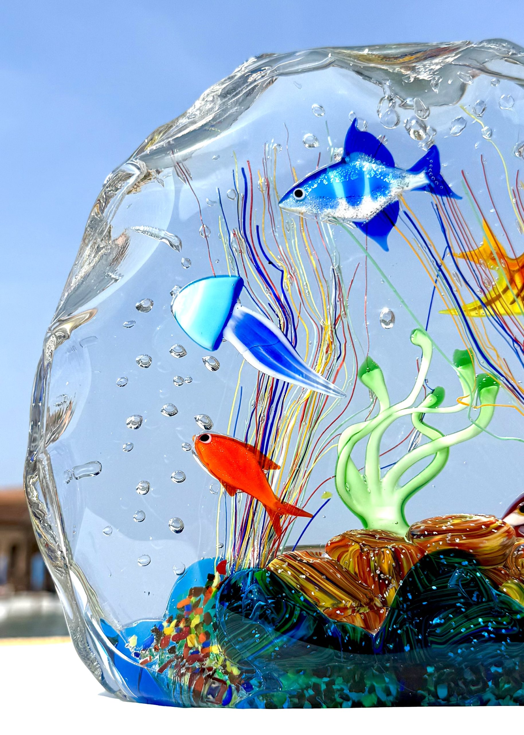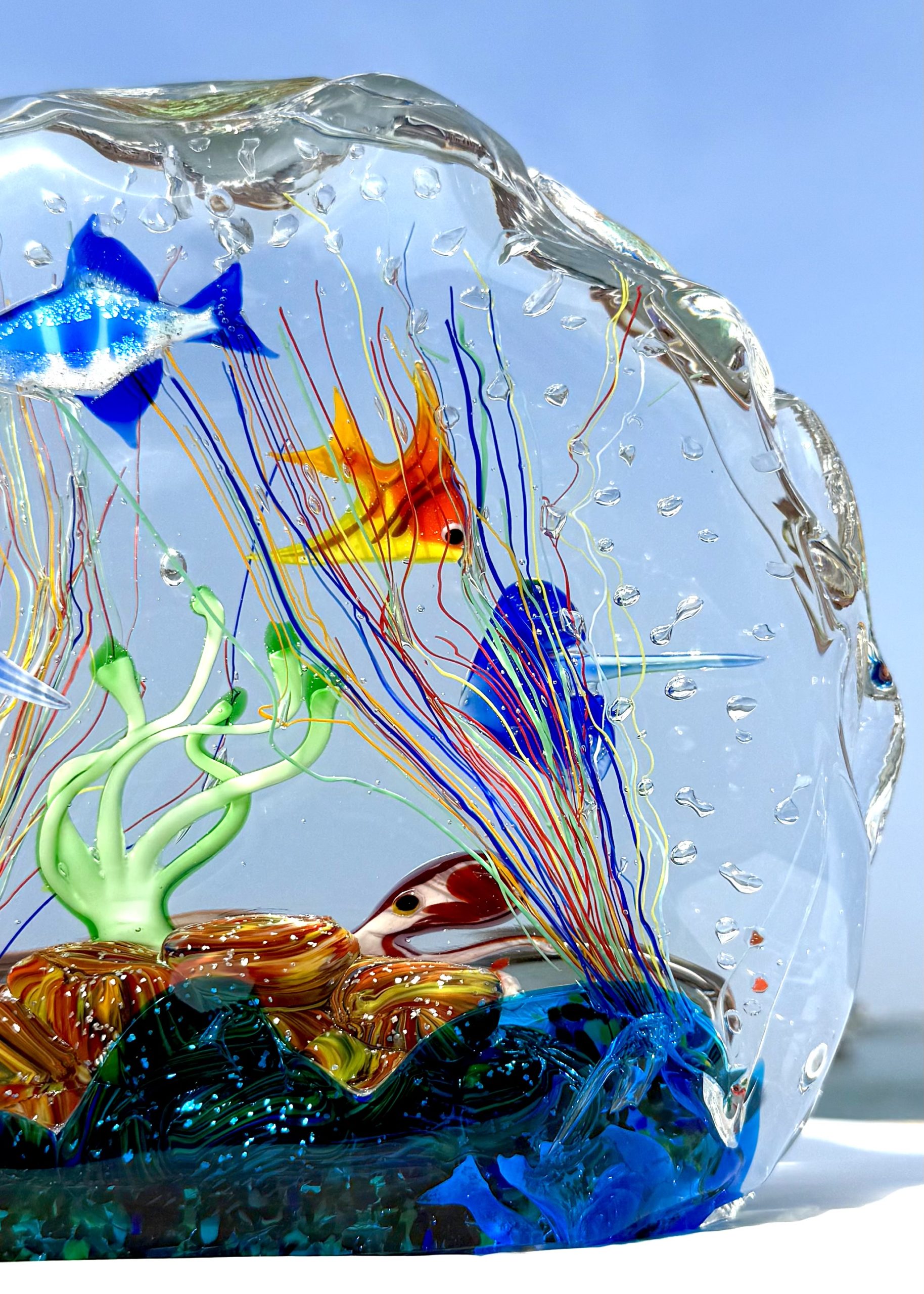 Half-moon aquarium sculpture in Murano glass.