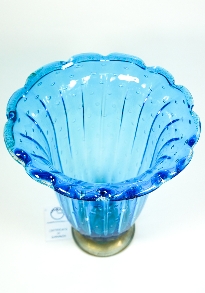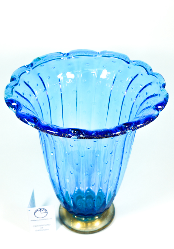 Handmade sea water venetian glass vase with 24kt gold decorations. Work performed by Murano artisans Imperio Rossi and Costantini. Vase signed with cold engraving by artist. The Murano glass vase has the label Marchio Vetro Artistico®.