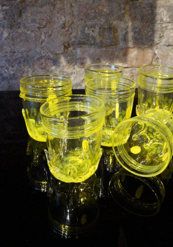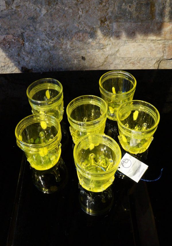 Summer: Elegant 6 handmade Murano glasses in venetian blown glass with working to “Mace” and Murrina yellow.