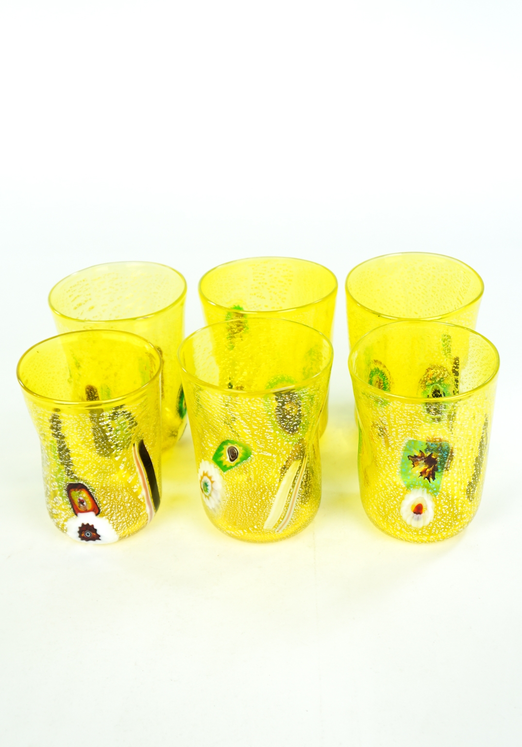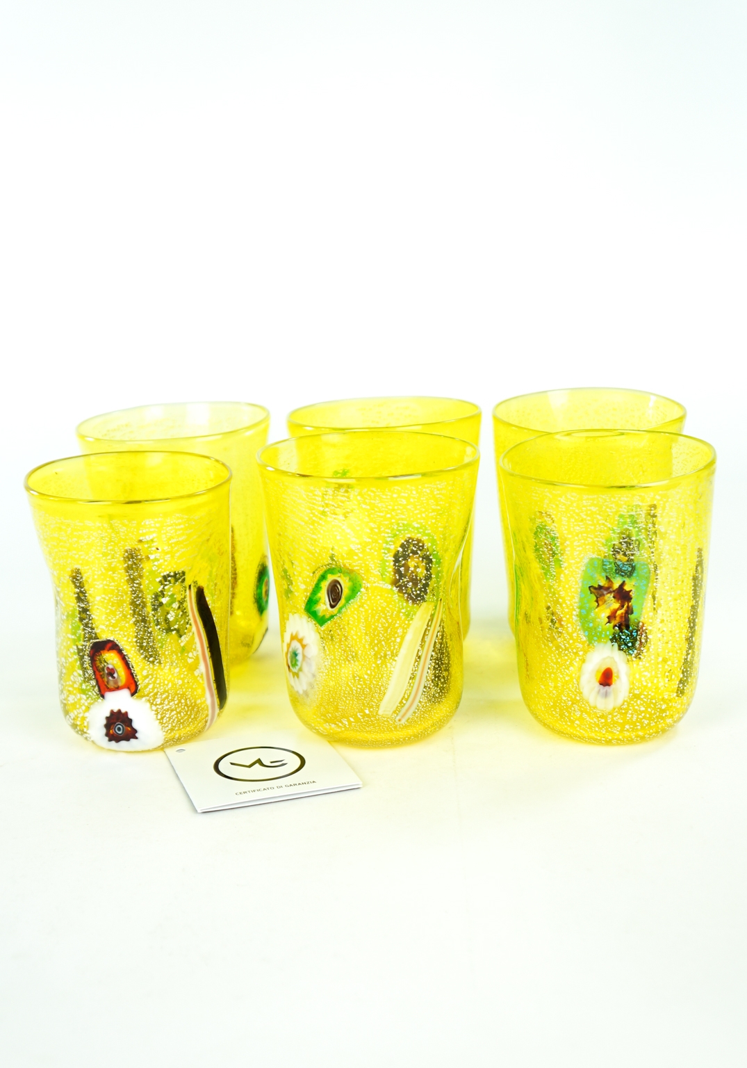 The set includes Six Murano Glass Tumblers with decoration in murrina Millefiori and real silver leaf.