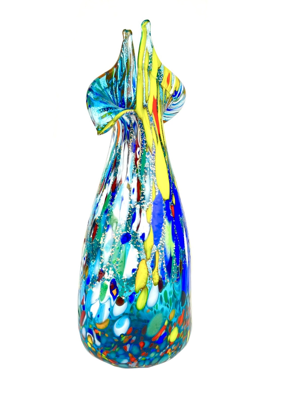 Murano blown glass vase with assorted decorations of millefiori murrina, mace and real silver leaf.