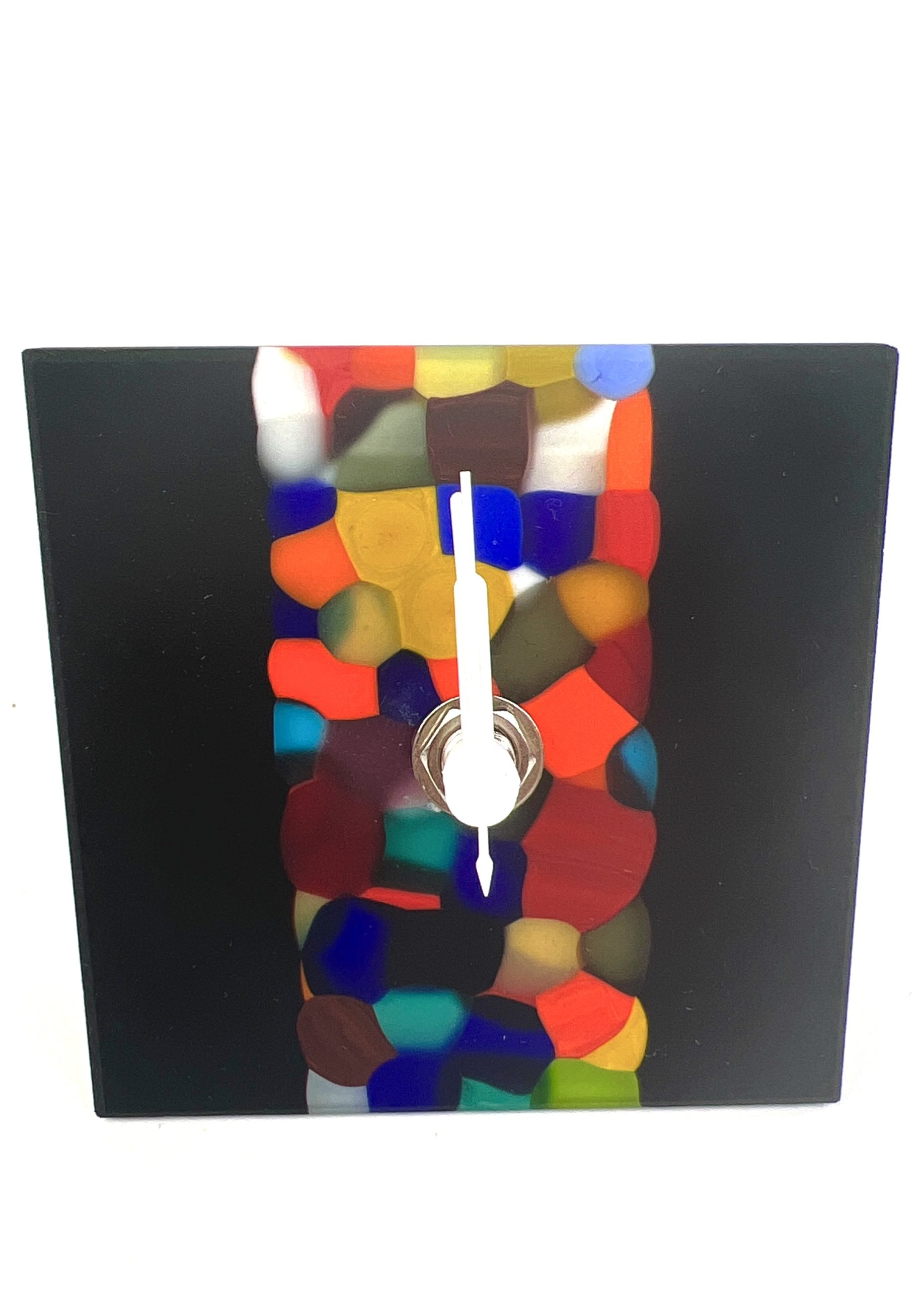 Black table clock in Murano glass with multicolored decorations.
