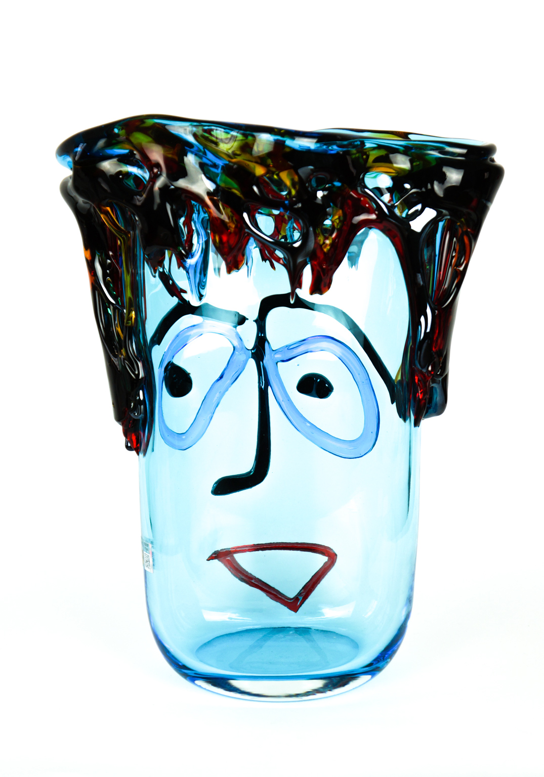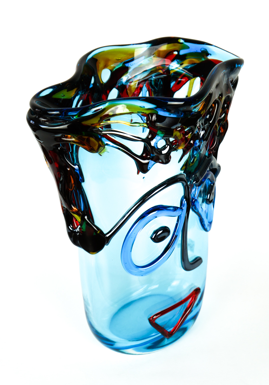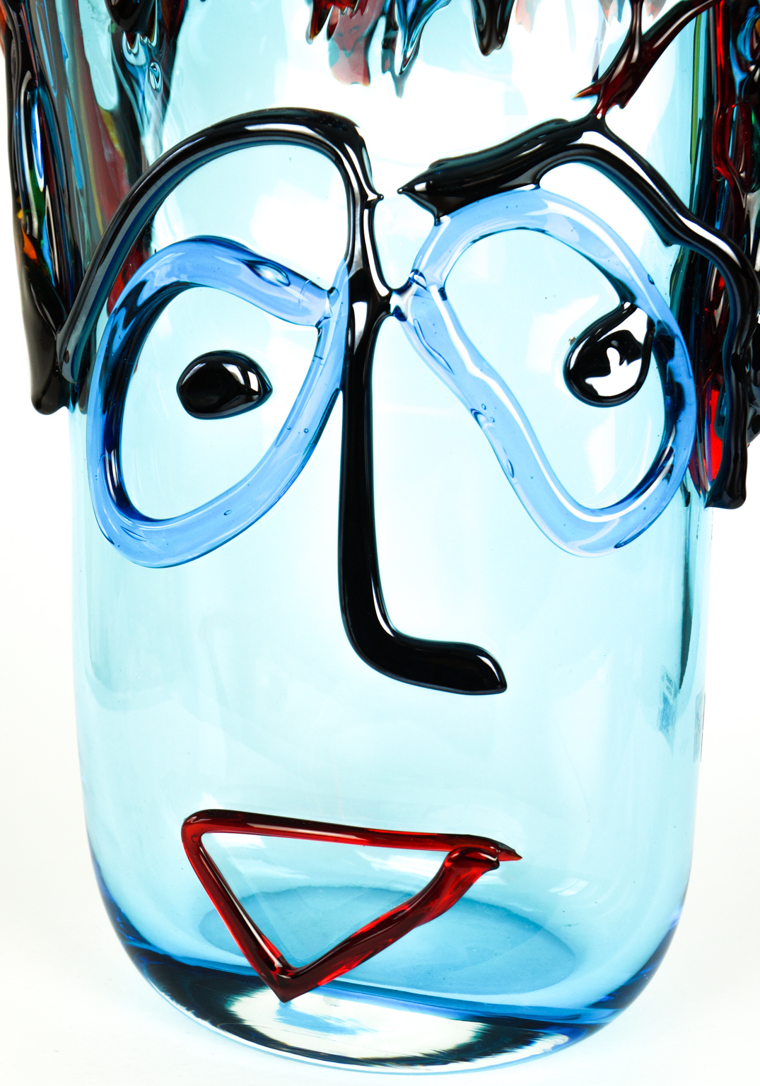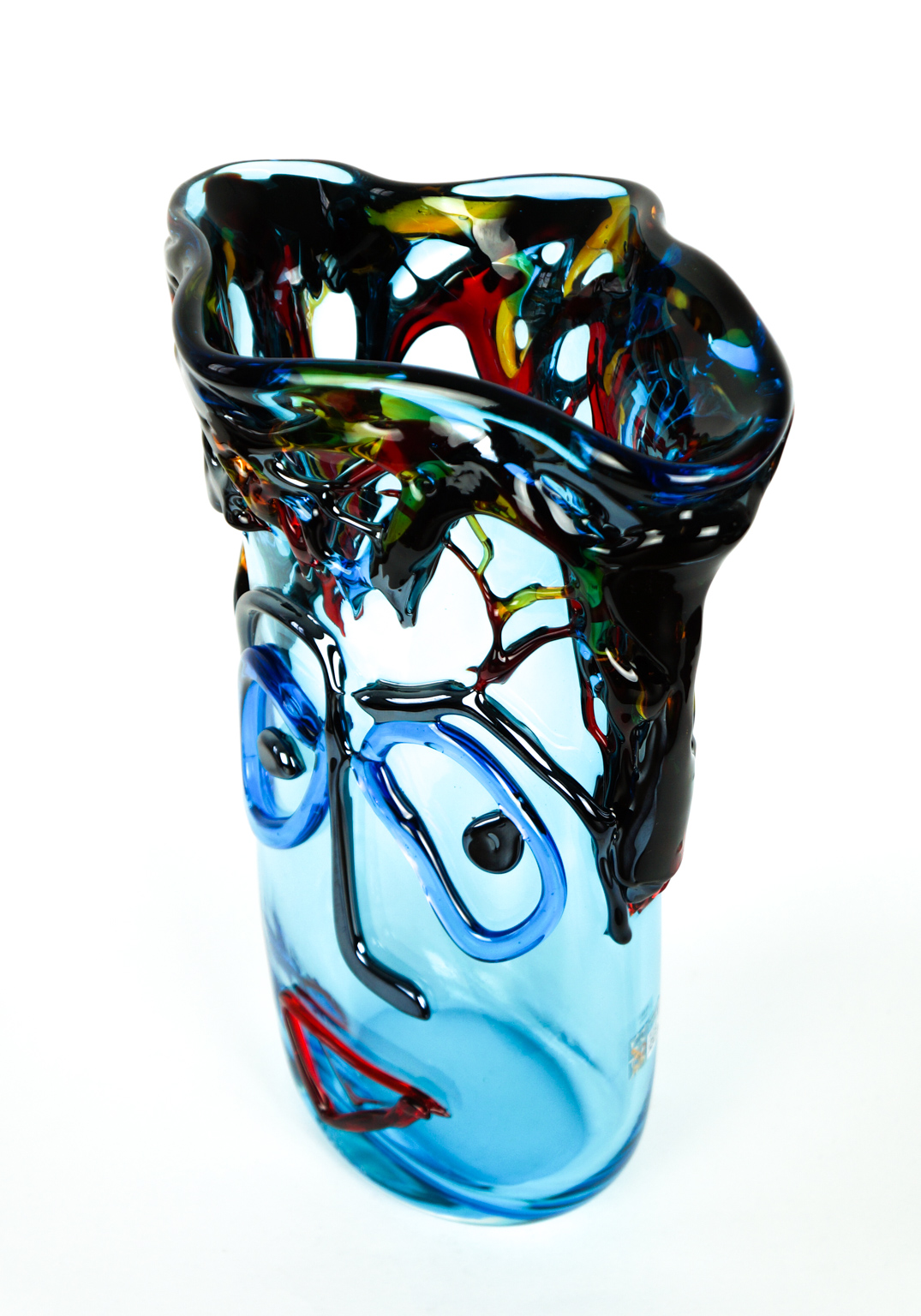 Tribute to Pablo Picasso, exclusive vase in blown Murano glass entirely handmade, aquamarine color with exterior blue, red, black and aquamarine glass wire decorations in relief.