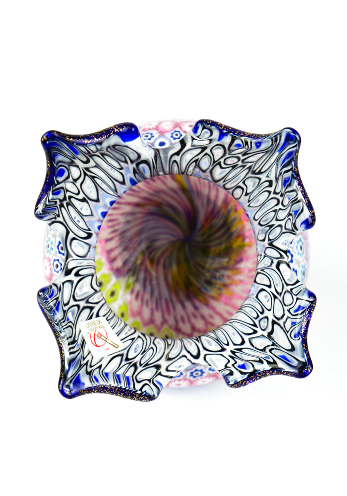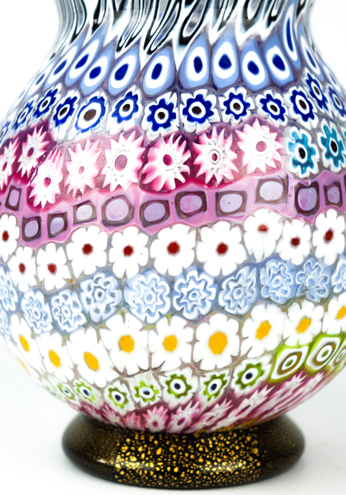 Exclusive working of Murano glass to produce this fantastic Venetian glass vase with murrine Millefiori and details with gold leaf 24 carats.