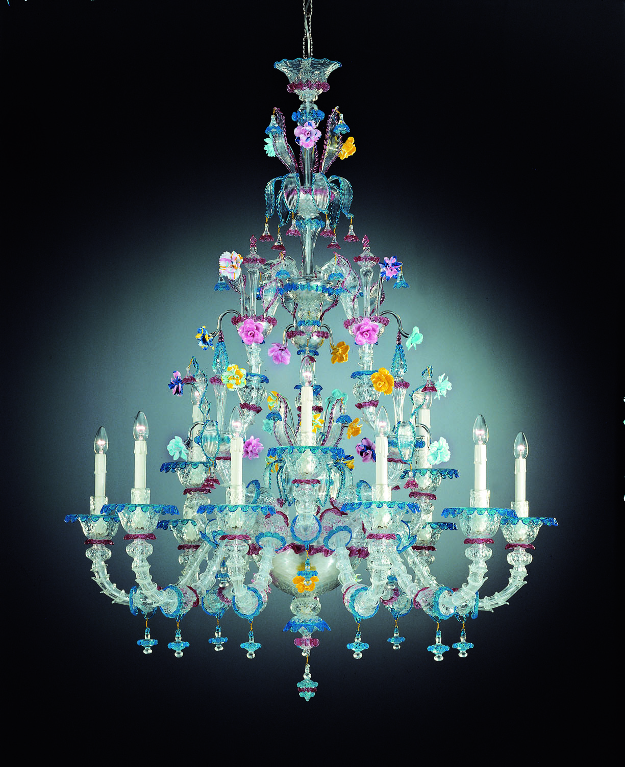 Special venetian glass chandelier model “Rezzonico“ with 12 lights colour crystal with polychrome decorations and coloured flowers in glass pulp. Completely handmade, carried out by the best Masters Murano artisans. This magnificent work will give light to any environment spreading elegance and warmth.