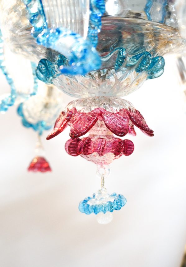 Elegant venetian glass chandelier special model “Rezzonico” with 6 lights colour crystal with polychrome decorations and flowers in coloured glass pulp. Completely handmade, carried out by the best Masters Murano artisans. This magnificent work will give light to any environment spreading elegance and warmth.