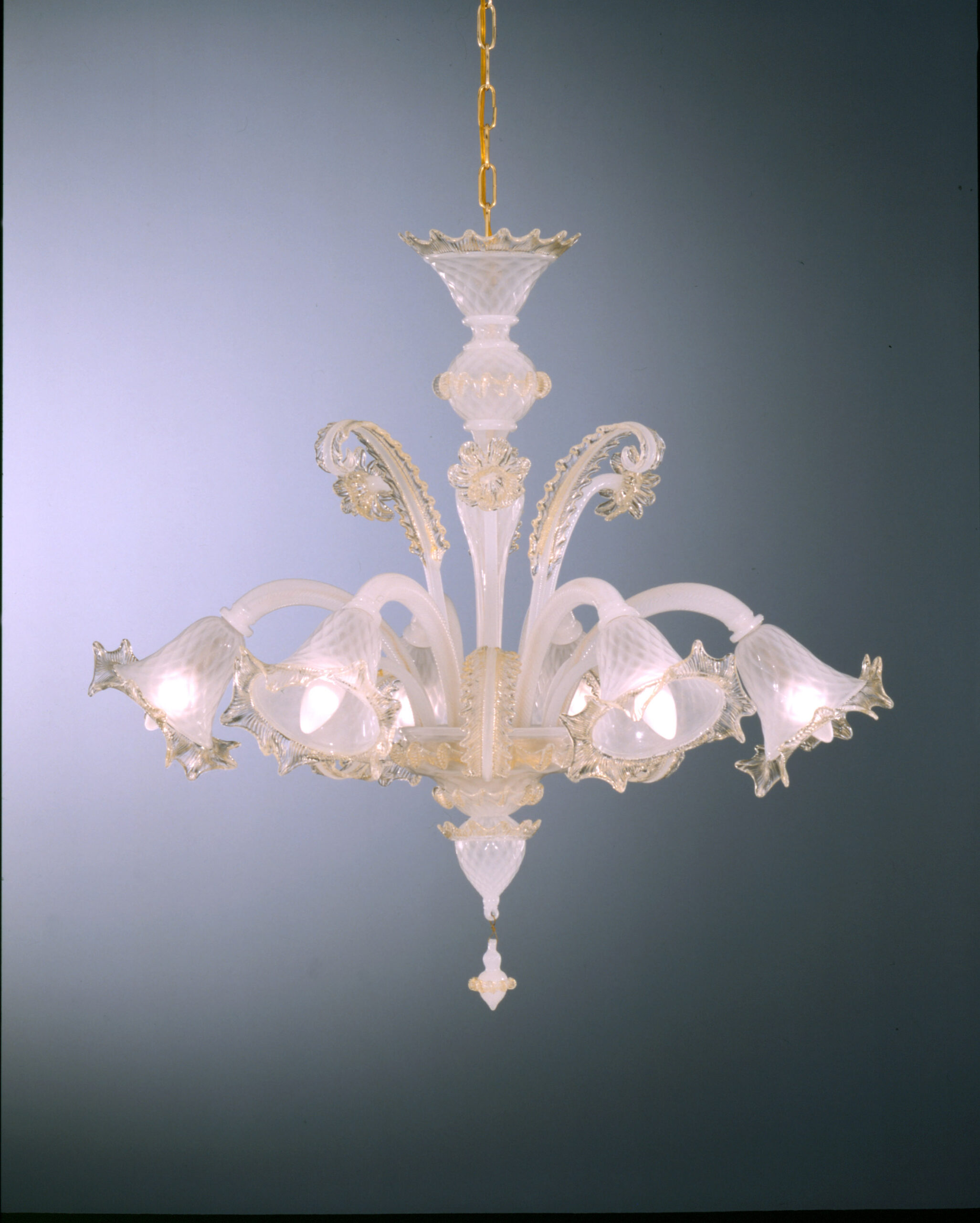 Venetian Blown glass chandelier “Salvador” with 6 lights colour silk with decorations in gold leaf 24 carats. Completely handmade, carried out by the best Masters Murano artisans. This magnificent work will give light to any environment spreading elegance and warmth.