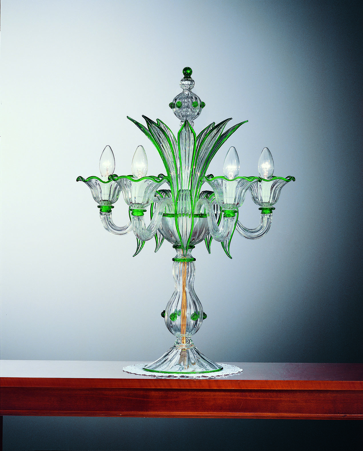 Flambeaux with 5 lights in Murano glass colour crystal all gold 24 carats with green decorations.