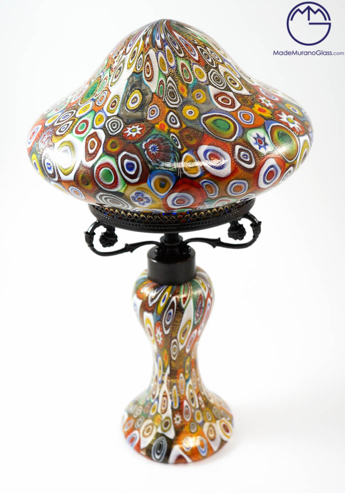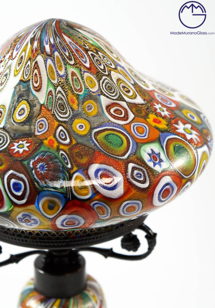 The working of venetian blown glass is represented in this magnificent “mushroom table lamp” with murrine millefiori and gold leaf 24 carats. Our skilled Murano artisans create this work freehand, making it unique and inimitable. Assembly will be performed according to your shipping country.