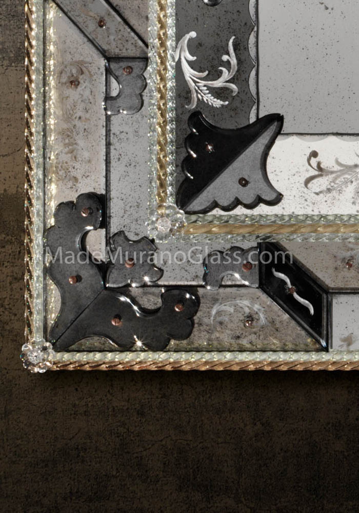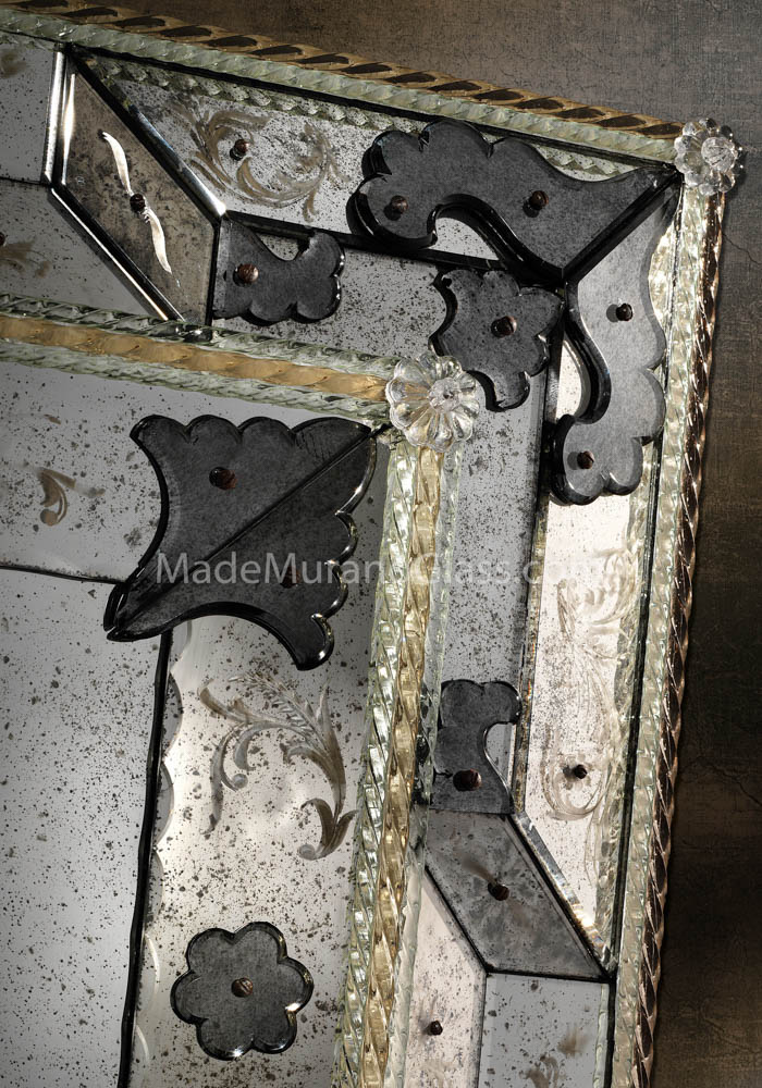 Elegant venetian glass mirror “Ca D’oro” in venetian glass completely carried out by Murano artisans which create decorative incisions in the mirror making it unique and inimitable. The mirror has chip in gold 24 carats and all silver incisions and decorations are handmade. The wooden structure is specially carried out by carpenters of Murano island.