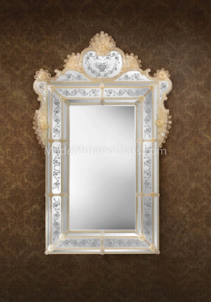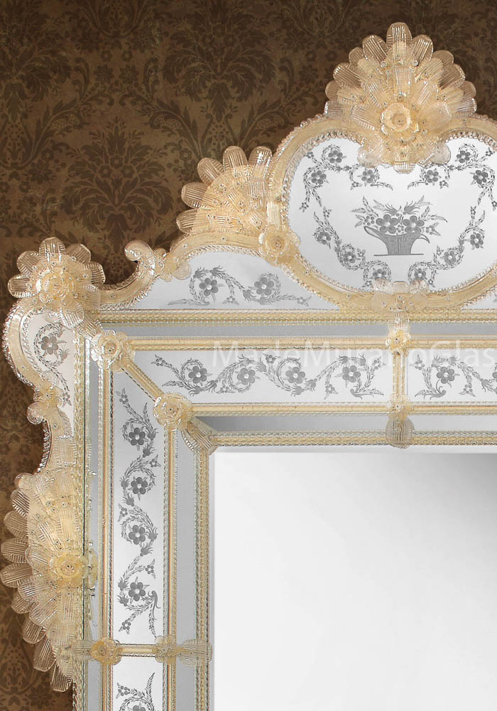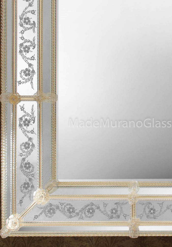 Exclusive venetian glass mirror “Elvis” in Murano glass completely carried out by Murano artisans which create decorative incisions in the mirror making it unique and inimitable. The mirror has 32 flowers, leaves and chip in gold 24 carats and all silver incisions and decorations are handmade. The wooden structure is specially carried out by carpenters of Murano island.