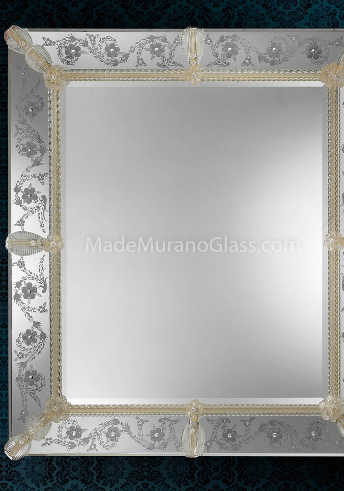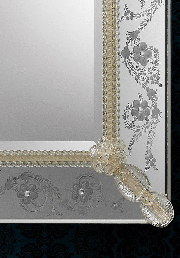 Exclusive venetian glass mirror “Illusion” in Murano glass completely carried out by Master Murano artisans which create decorative incisions making it unique and inimitable. The mirror has chip and decorations in silvered glass all produced hand-free by Murano artisans. The wooden structure is specially carried out by carpenters of Murano island.