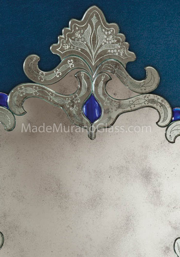 Exclusive venetian glass mirror “Lazzaro” in Murano glass completely carried out by Master Murano artisans which create decorative incisions making it unique and inimitable. The mirror has chip and decorations in silvered glass all produced hand-free by Murano artisans. The wooden structure is specially carried out by carpenters of Murano island.