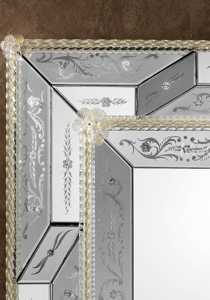 Elegant venetian glass mirror “Lido” in Murano glass completely carried out by Murano artisans which create decorative incisions in the mirror making it unique and inimitable. The mirror has 16 flowers, leaves and chip in gold 24 carats and all silver incisions and decorations are handmade. The wooden structure is specially carried out by carpenters of Murano island.