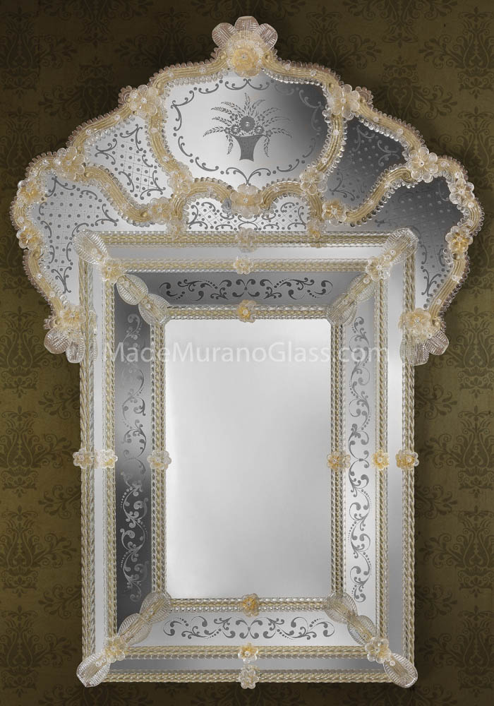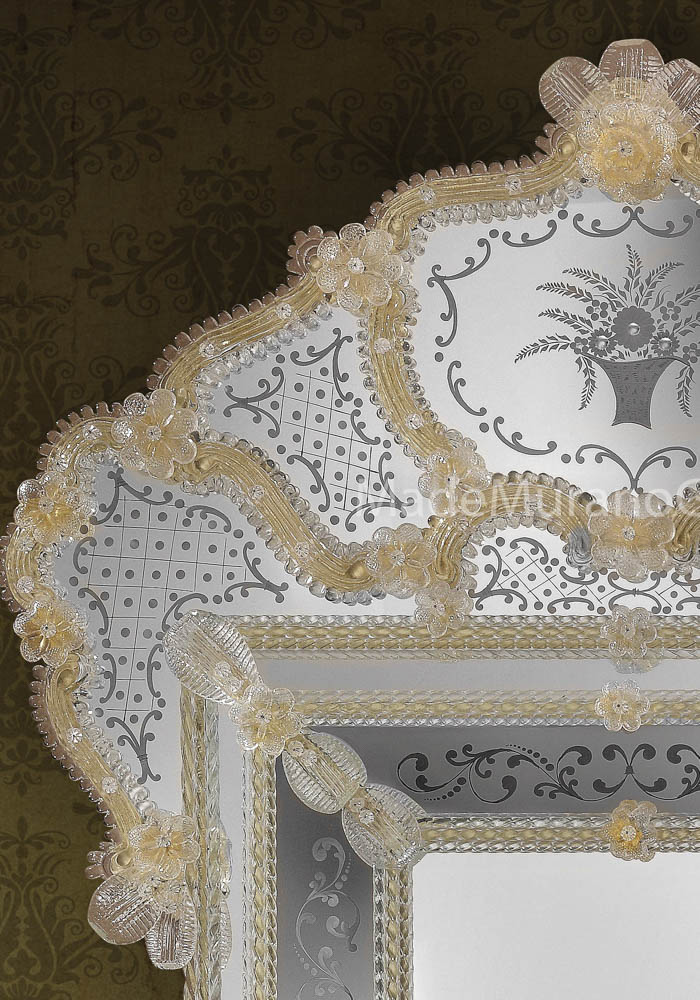 Exclusive venetian glass mirror “Paris” in Murano glass completely carried out by Murano artisans which create decorative incisions in the mirror making it unique and inimitable. The mirror has 34 flowers, leaves and chip in gold 24 carats and all silver incisions and decorations are handmade. The wooden structure is specially carried out by carpenters of Murano island.