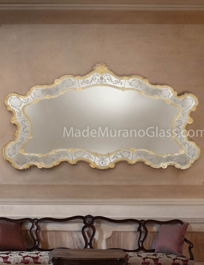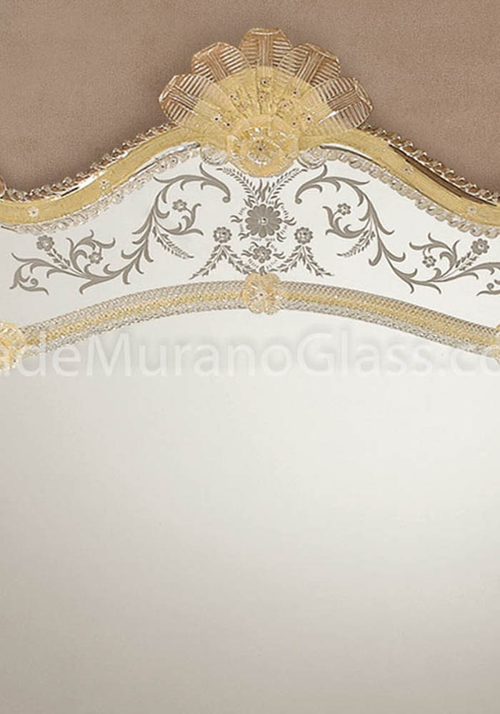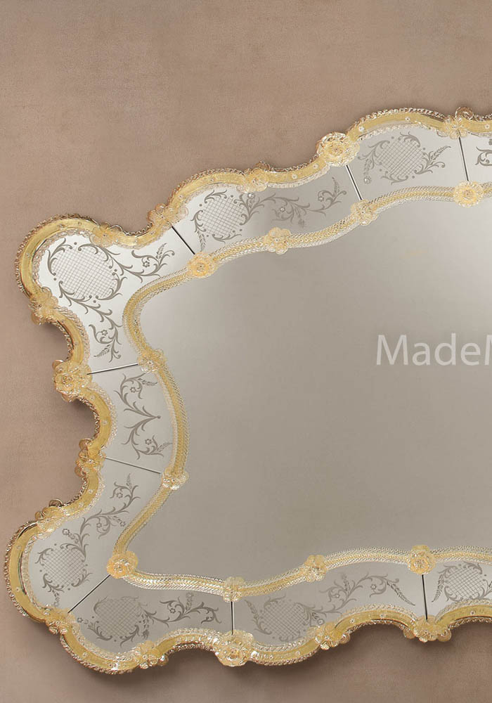 Exclusive venetian glass mirror “Reale” in Murano glass completely carried out by Murano artisans which create decorative incisions in the mirror making it unique and inimitable. The mirror has 54 flowers, leaves and chip in gold 24 carats and all silver incisions and decorations are handmade. The wooden structure is specially carried out by carpenters of Murano island.