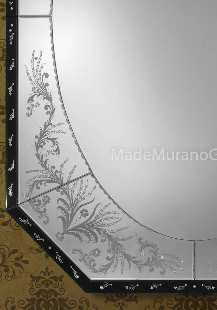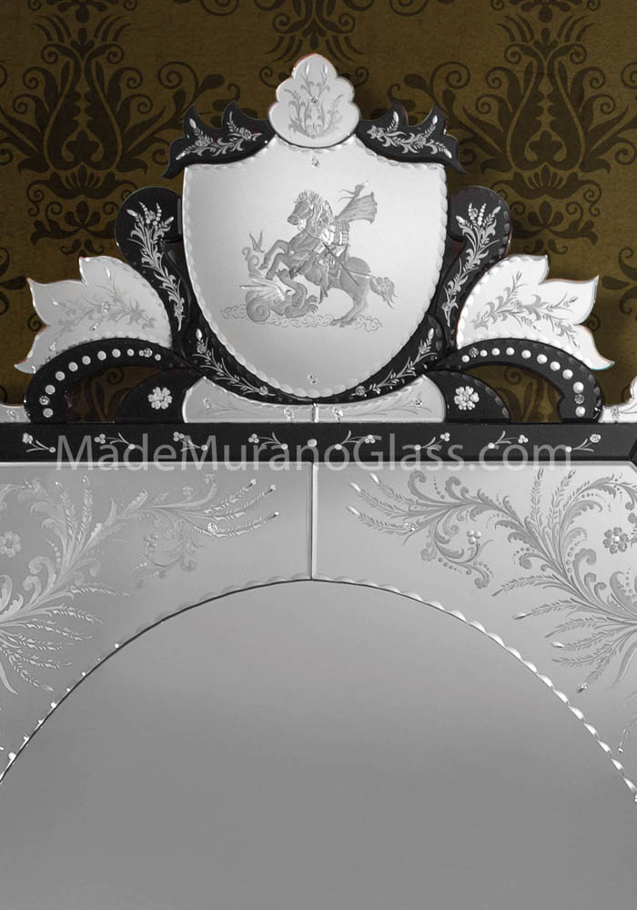 Exclusive venetian glass mirror “San Giorgio” in Murano glass completely carried out by Master Murano artisans which create decorative incisions making it unique and inimitable. The mirror has chip and decorations in silvered glass all produced hand-free by Murano artisans. The wooden structure is specially carried out by carpenters of Murano island.