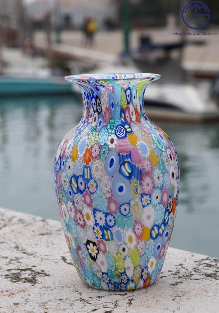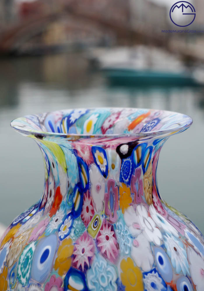 Exclusive working of Murano glass, coloured vase with murrine millefiori harlequin transparent.