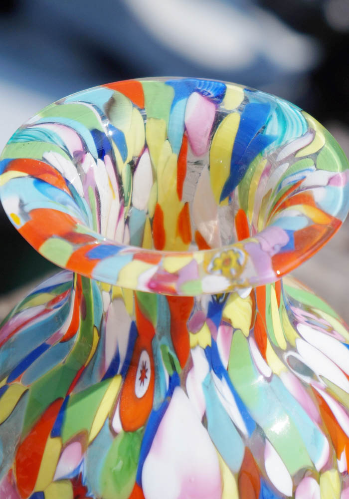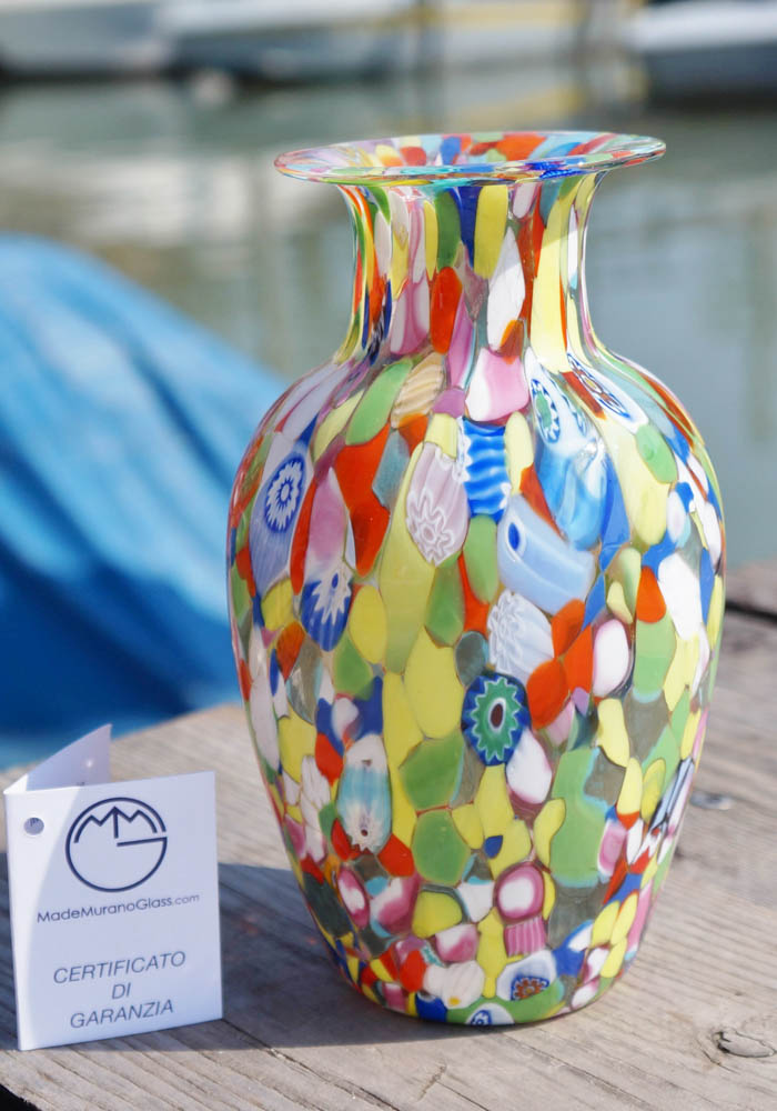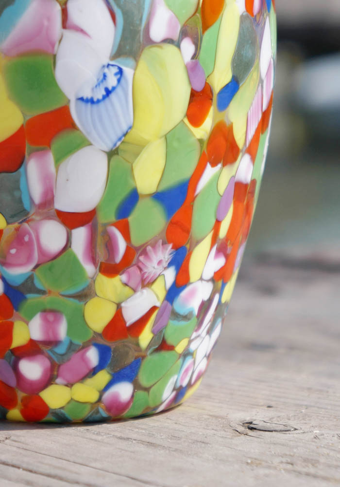 Amazing processing of venetian glass to produce this coloured venetian glass vase with “mace”. The placement of “mace” (small pieces of glass) shall be carried out with care and precision by Murano artisans. Small pieces are carefully placed one by one in a hot-plate and after them melted together with Murano crystals making a colourful mosaic.