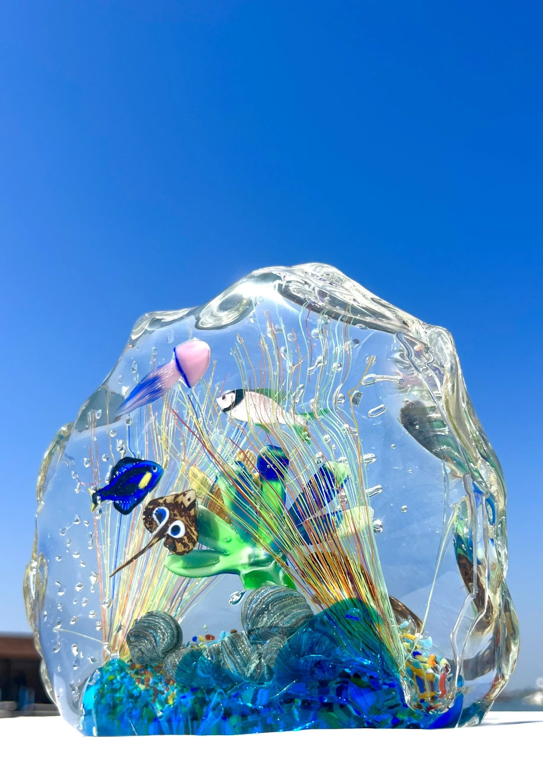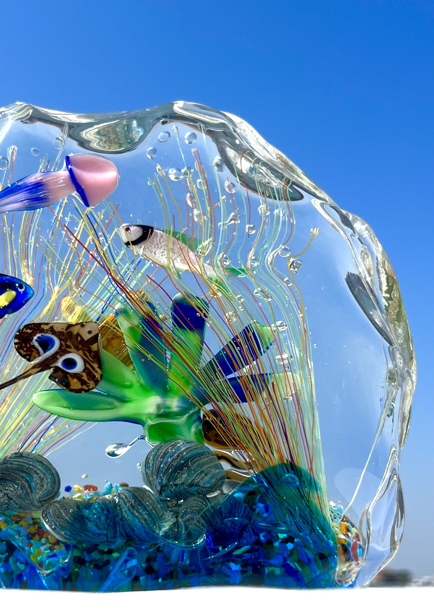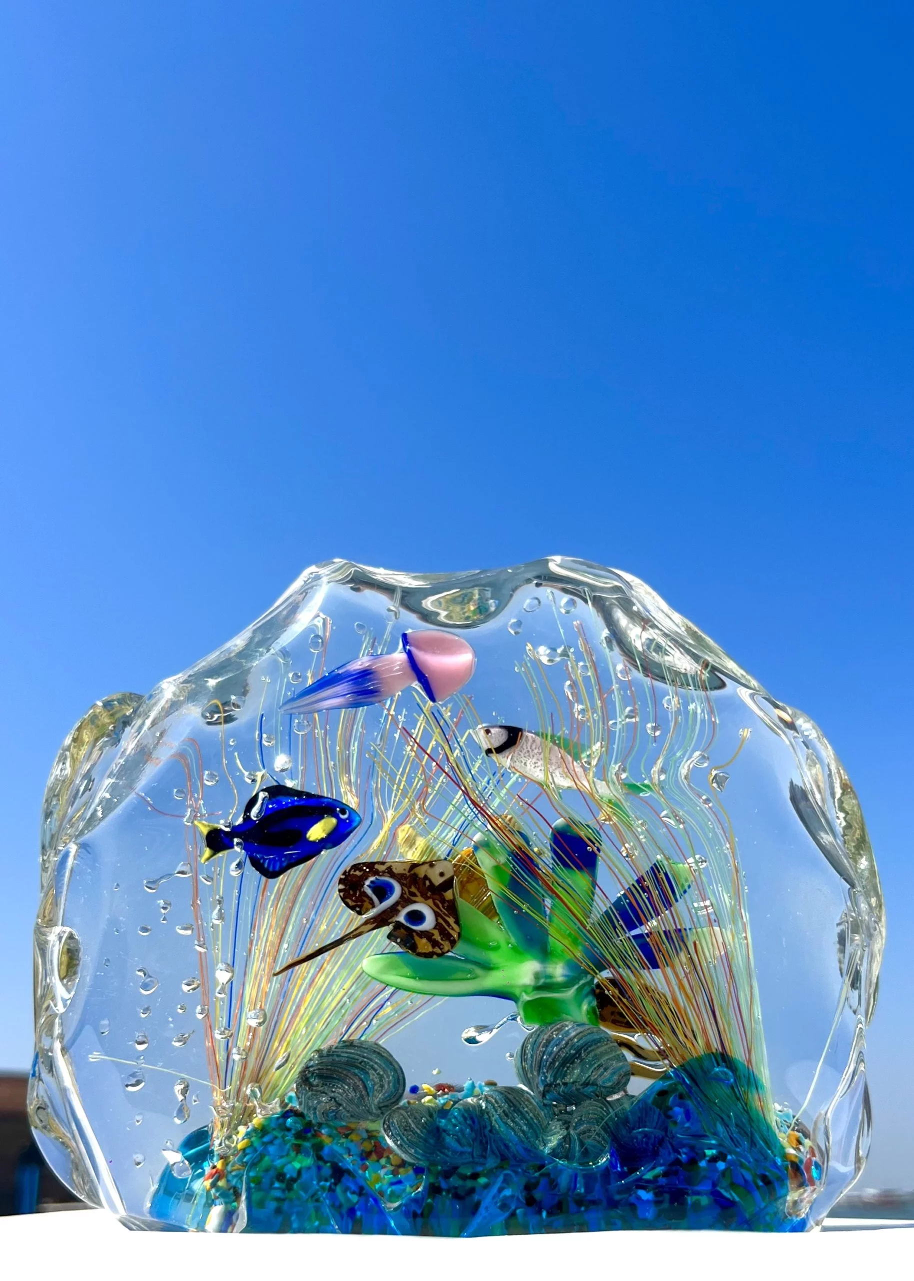 Half-moon aquarium sculpture in Murano glass.