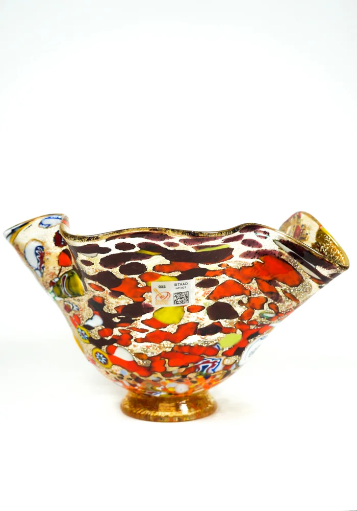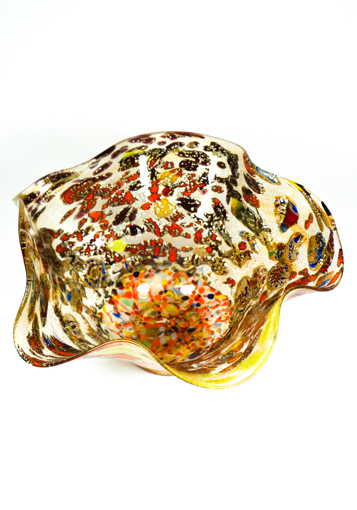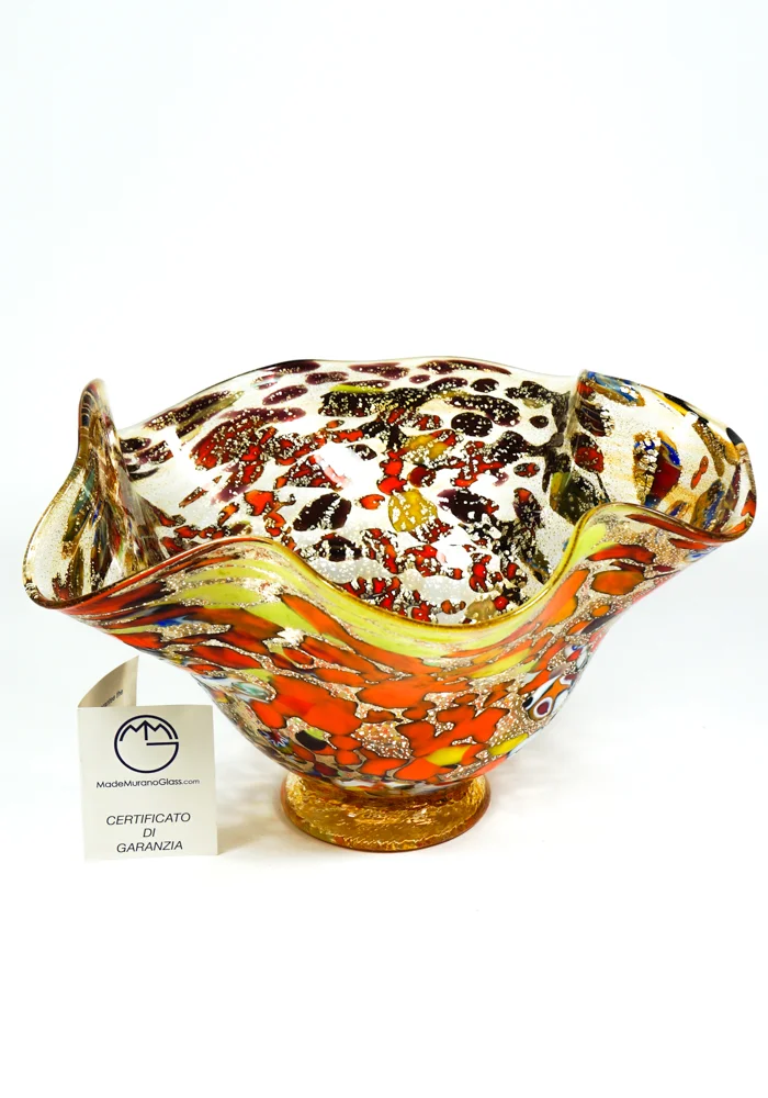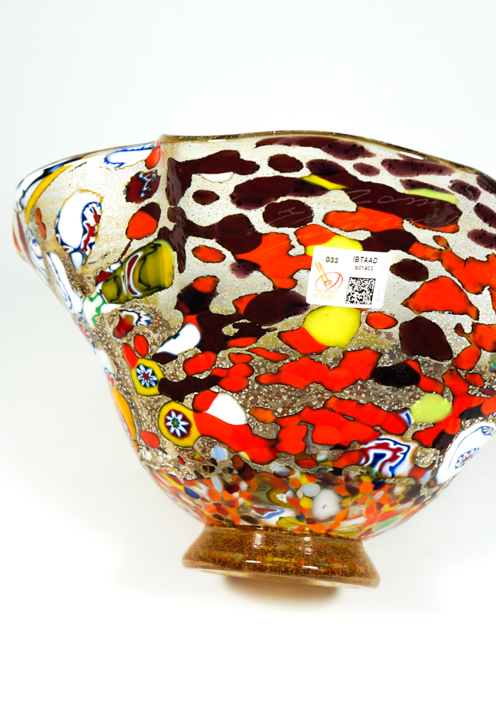 Murano glass bowl amber with assorted filigree decorations, Murrina Millefiori, “Mace” and silver. “I. Rossi” glassmaker Master mixes these colors in an ever different way, making the works so unique and inimitable. Vase signed with cold engraving. The vase has the label Marchio Vetro Artistico® Murano.