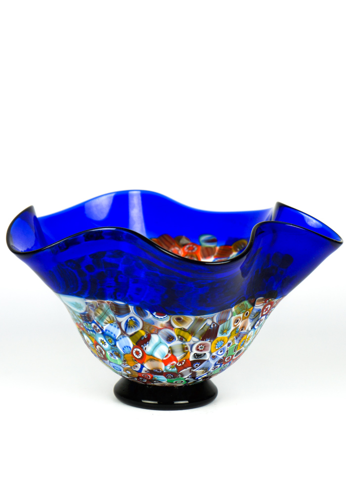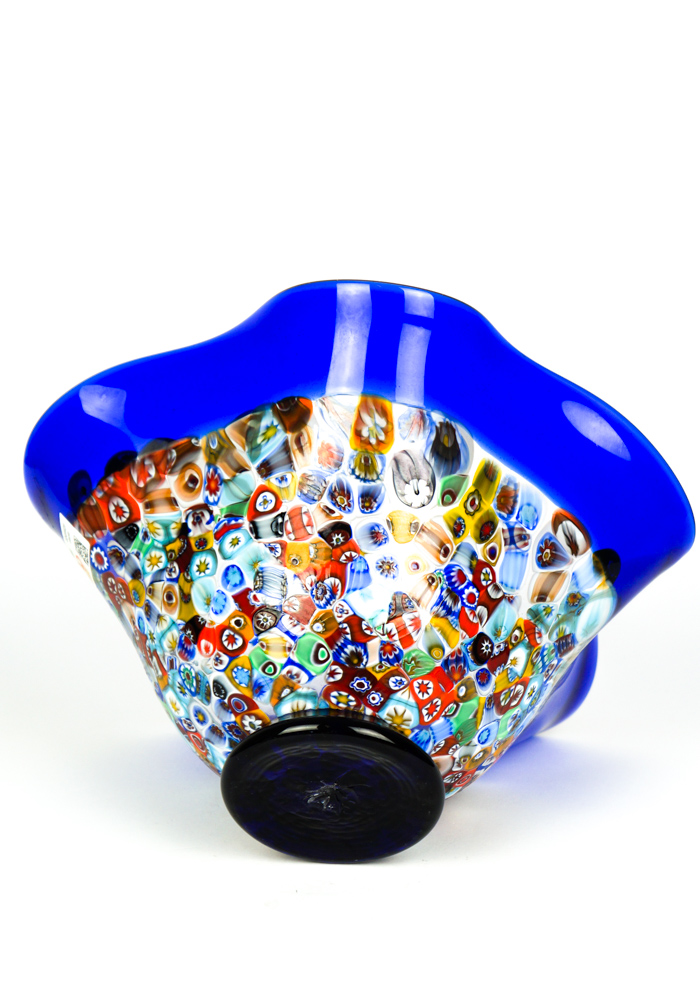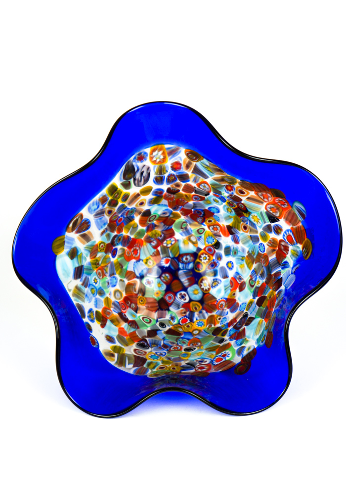 Fisty is a Bowl in blown blue glass with decorations in Murrina Millefiori.
