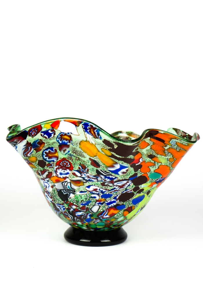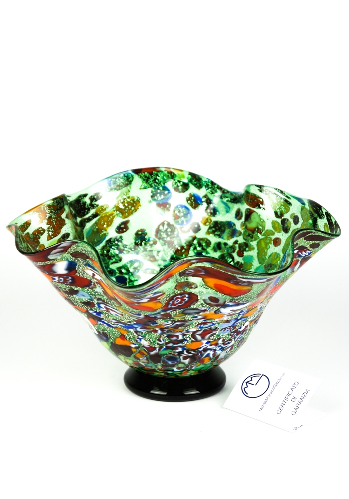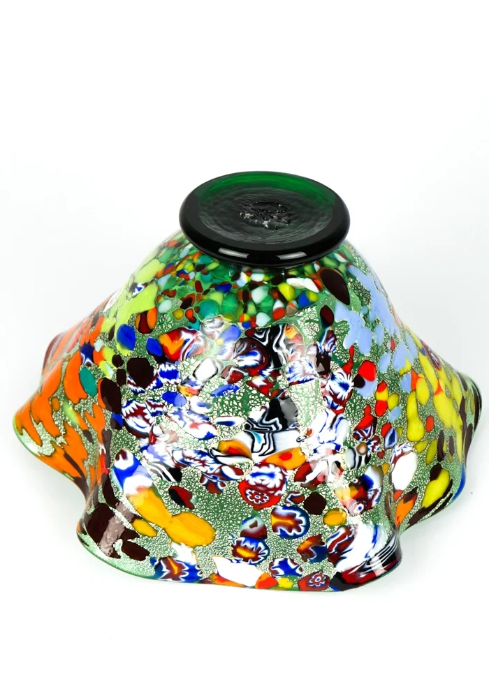 Murano glass bowl green with assorted filigree decorations, Murrina Millefiori, “Mace” and silver leaf. “I. Rossi” glassmaker Master mixes these colors in an ever different way, making the works so unique and inimitable. Vase signed with cold engraving. The vase has the label Marchio Vetro Artistico® Murano.