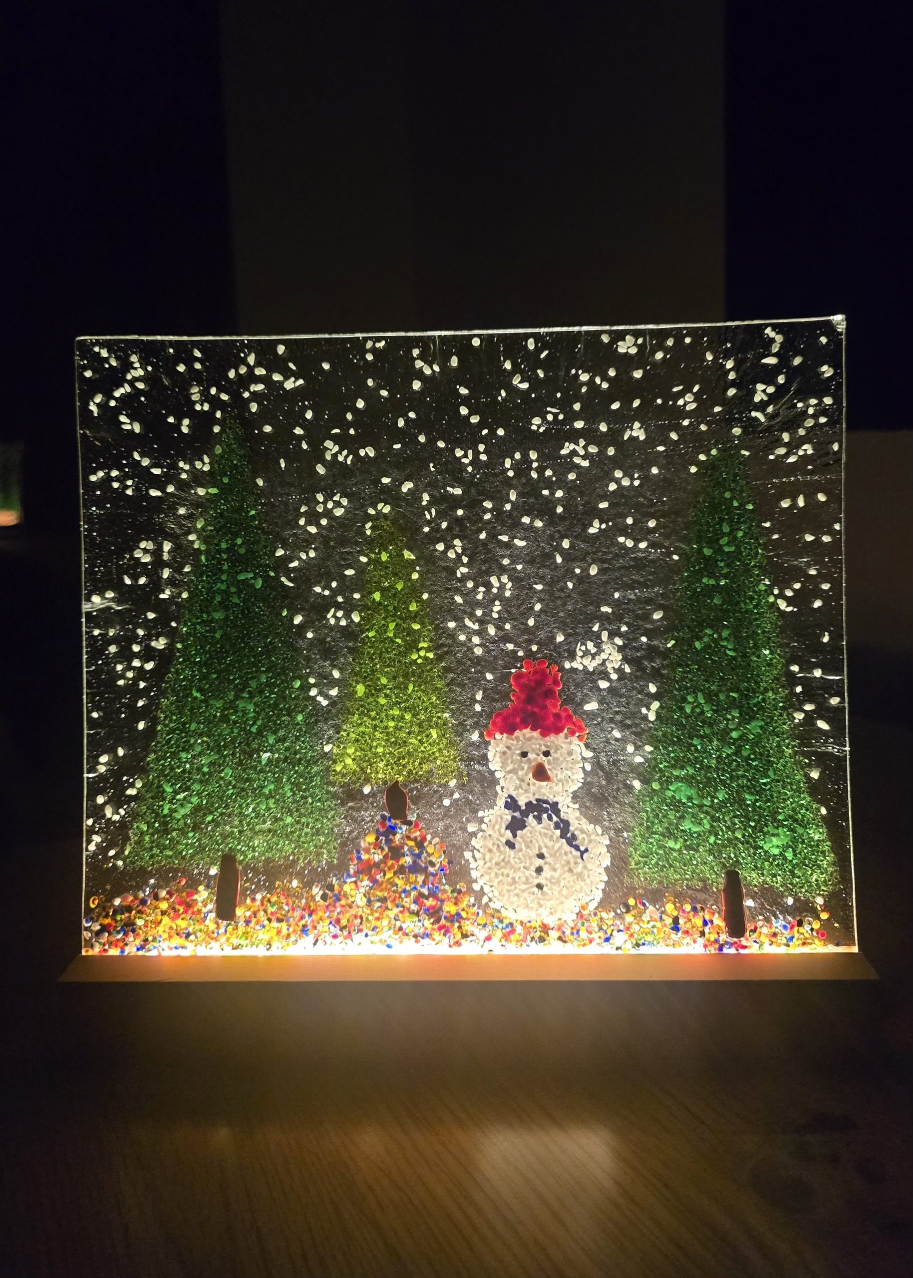 This product includes a wooden base with warm light.