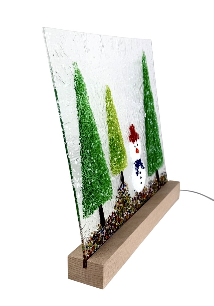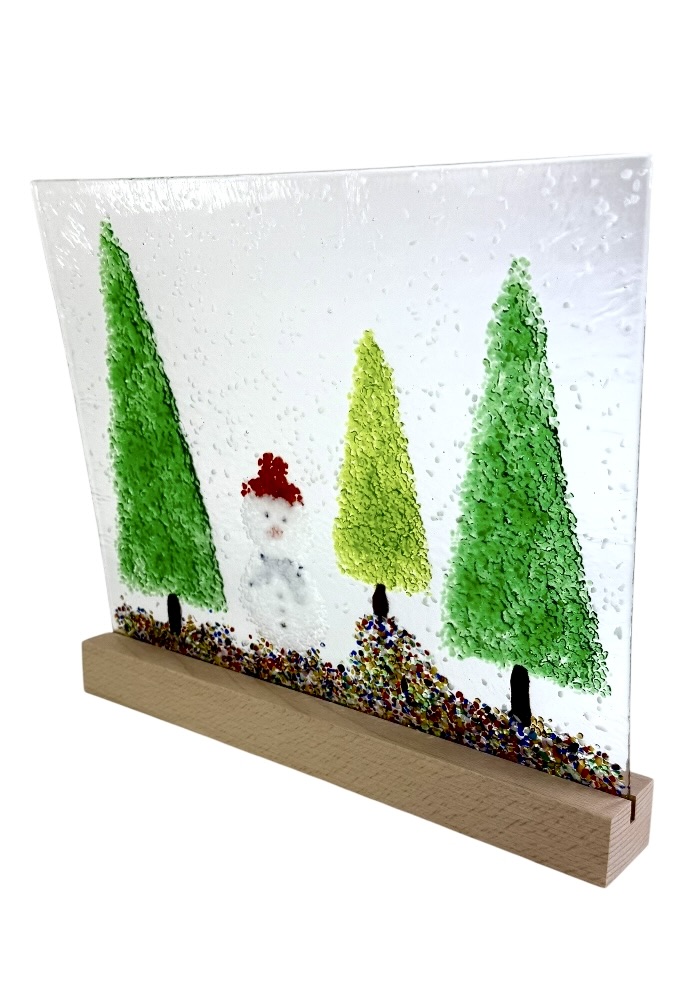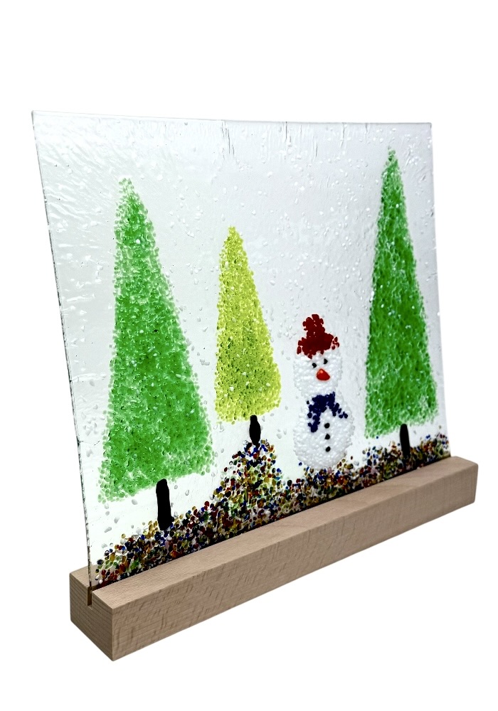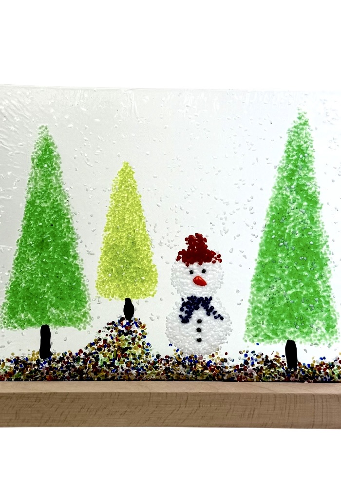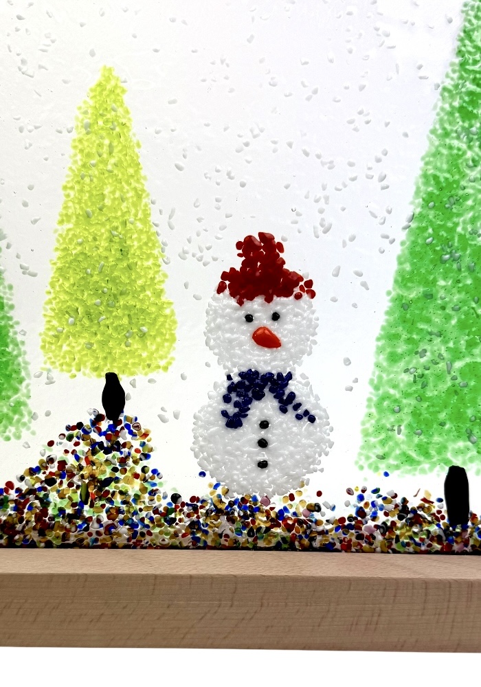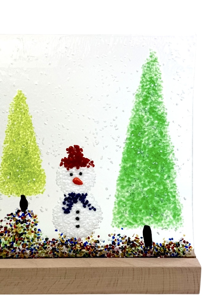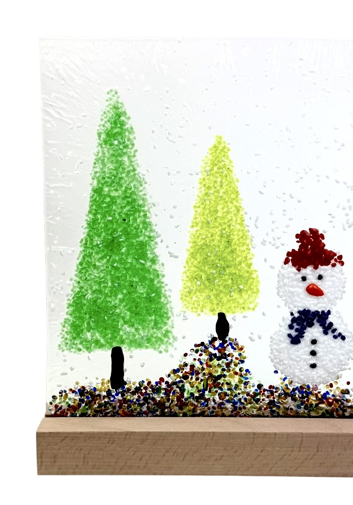 Murano glass sculpture depicting three trees and a Christmas snowman.