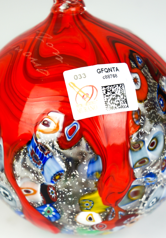 Exclusive Christmas ball in Murano blown glass with Millefiori murrina decoration, covered in real silver leaf and red glass detail.