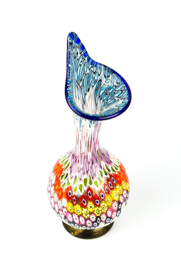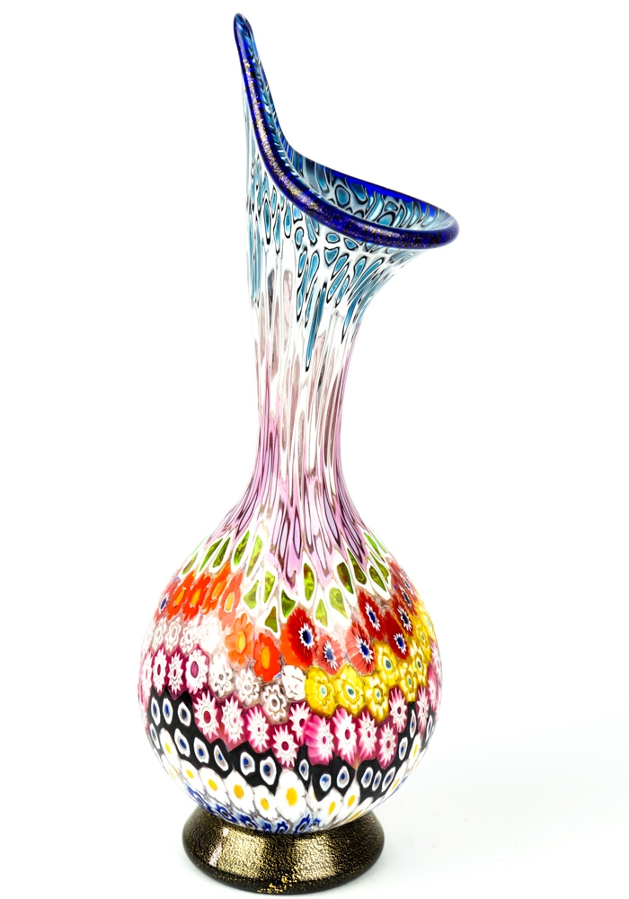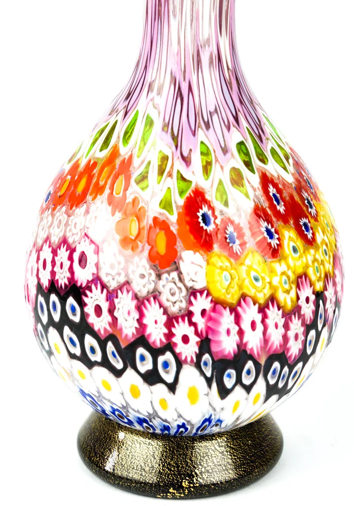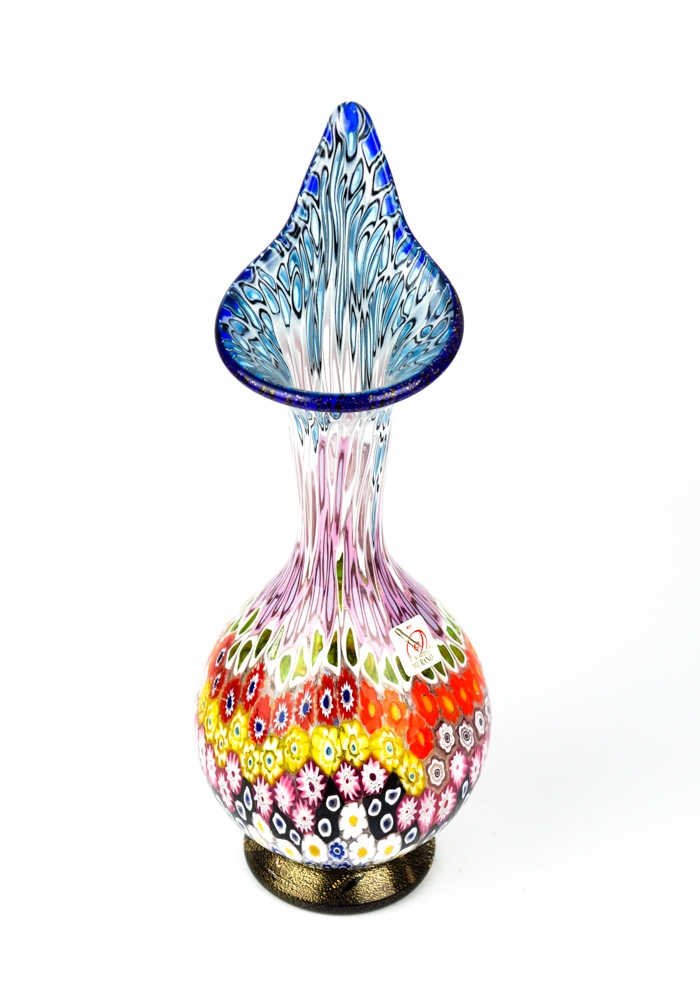 Exclusive working of Murano glass to produce this fantastic venetian glass vase with murrine Millefiori and details with gold leaf 24 carats. This work is unique in the world for its combination of colors, elegance and sophistication. The placement of murrine shall be carried out with care and precision by Murano artisans.
